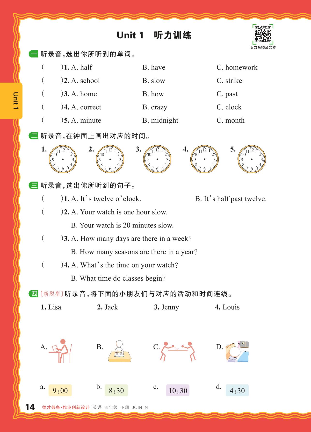 2024春下册四年级英语剑桥版 Unit 1 听力训练