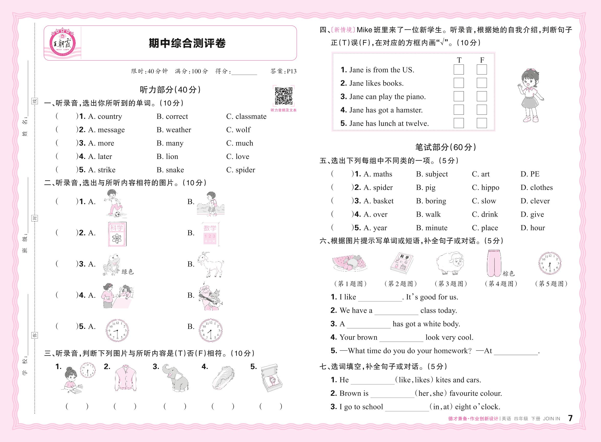 2024春下册四年级英语剑桥版 期中综合测评卷