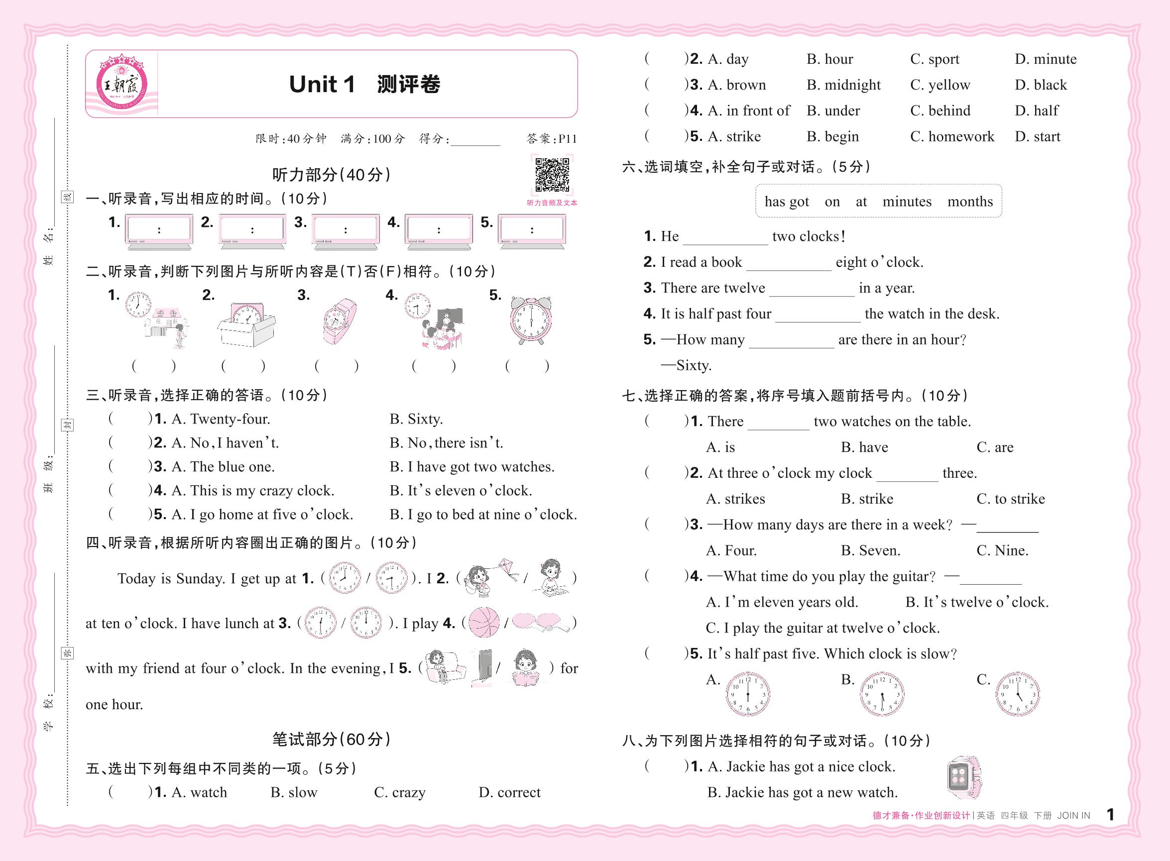 2024春下册四年级英语剑桥版 Unit 1 测评卷
