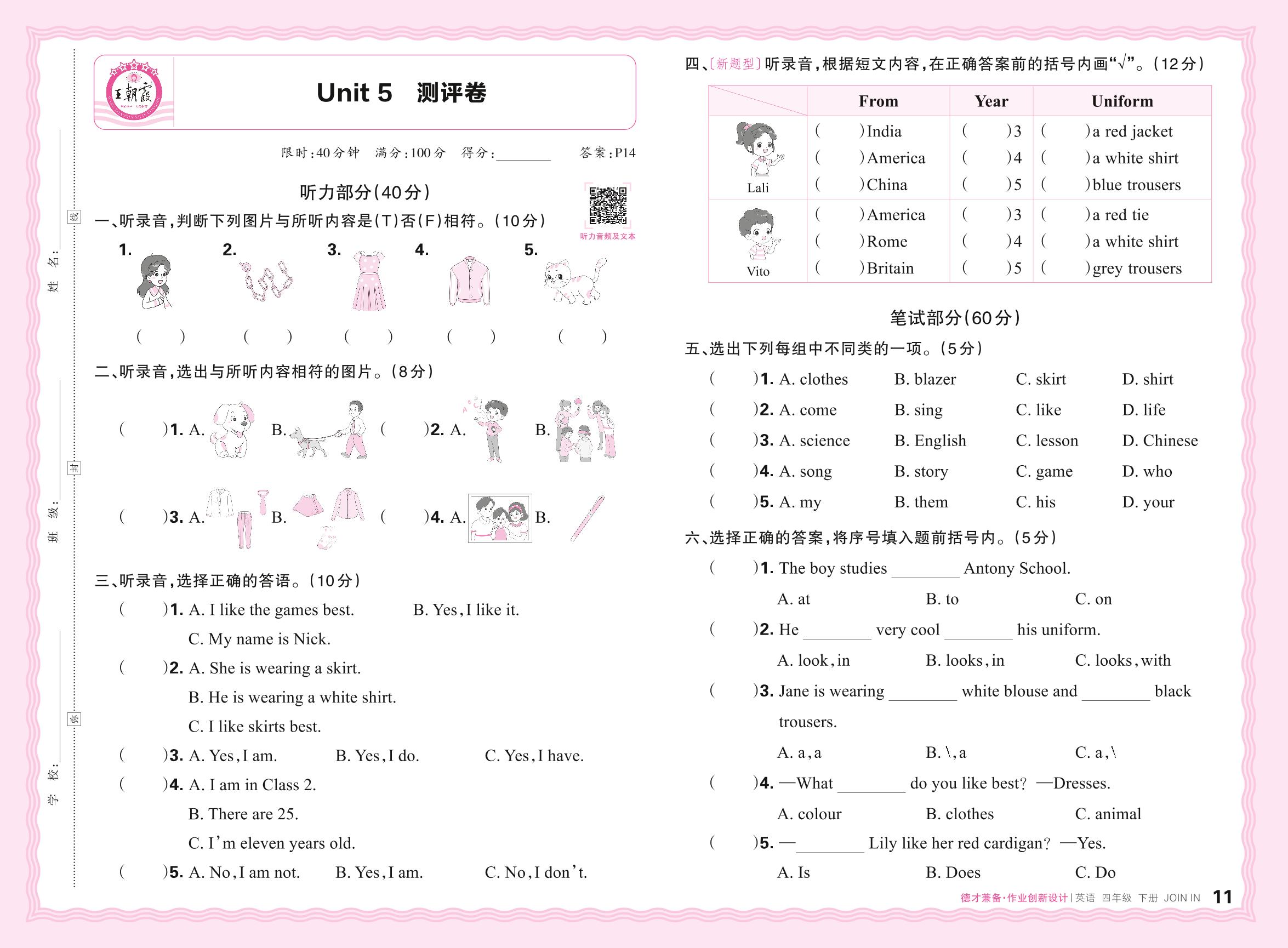 2024春下册四年级英语剑桥版 Unit 5 测评卷