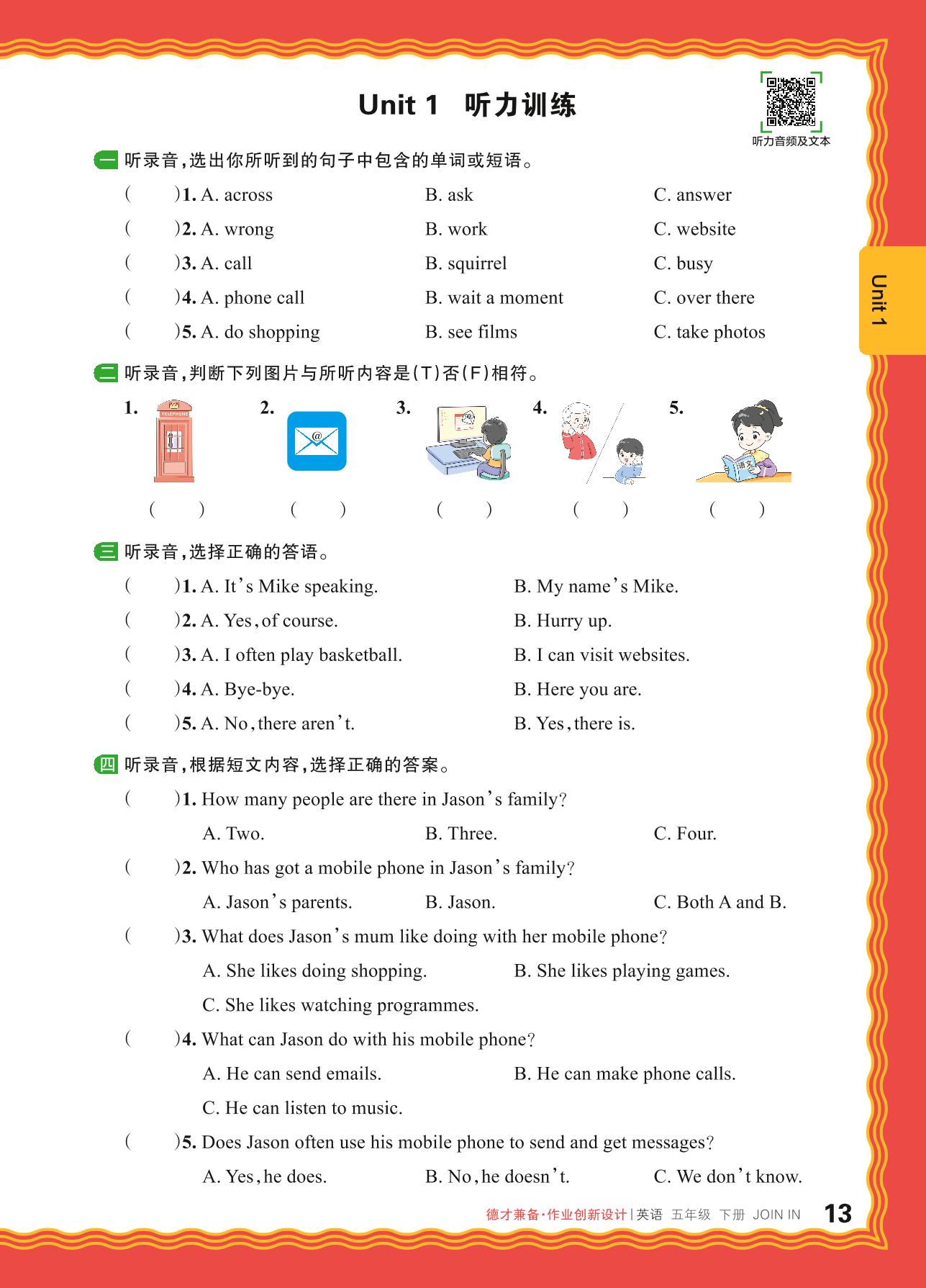 2024春下册五年级英语剑桥版 Unit 1 听力训练