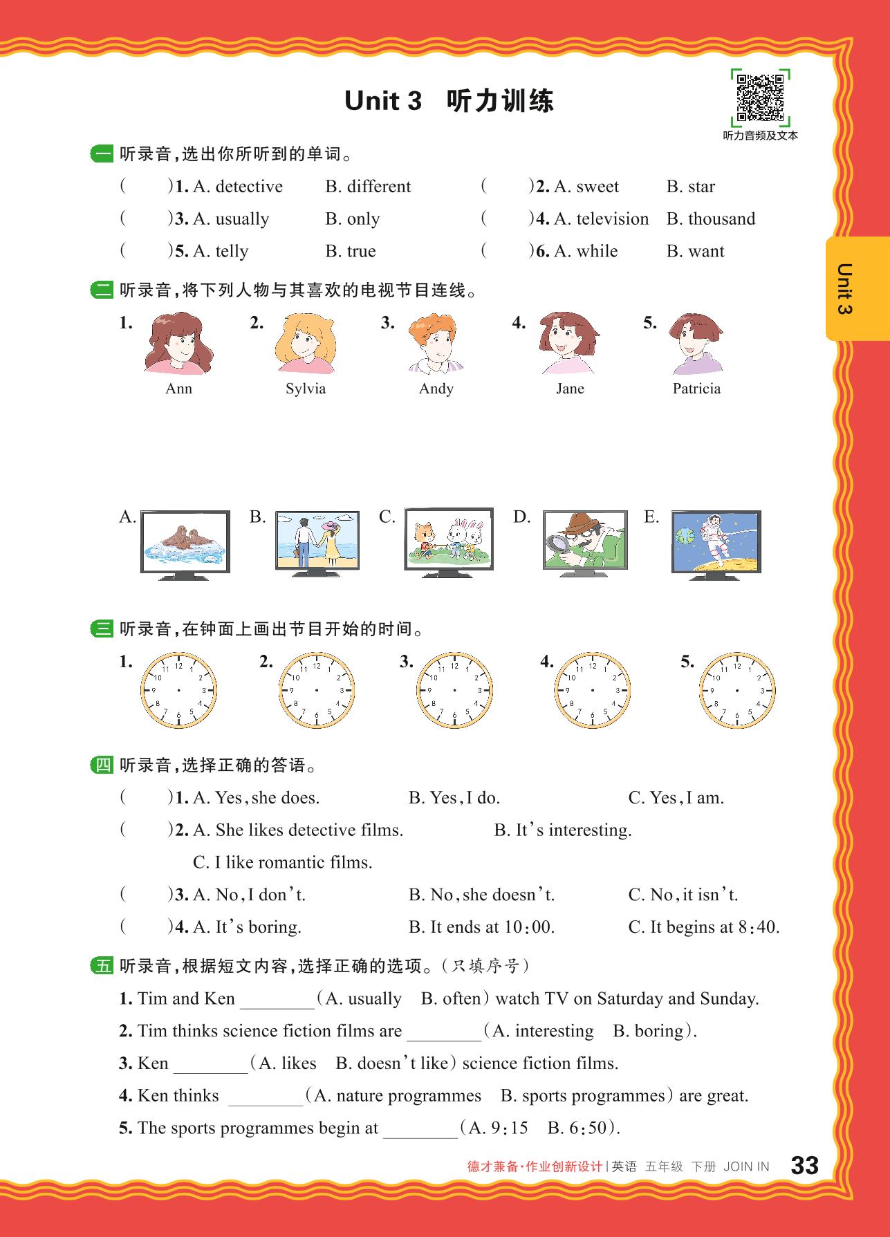 2024春下册五年级英语剑桥版 Unit 3 听力训练