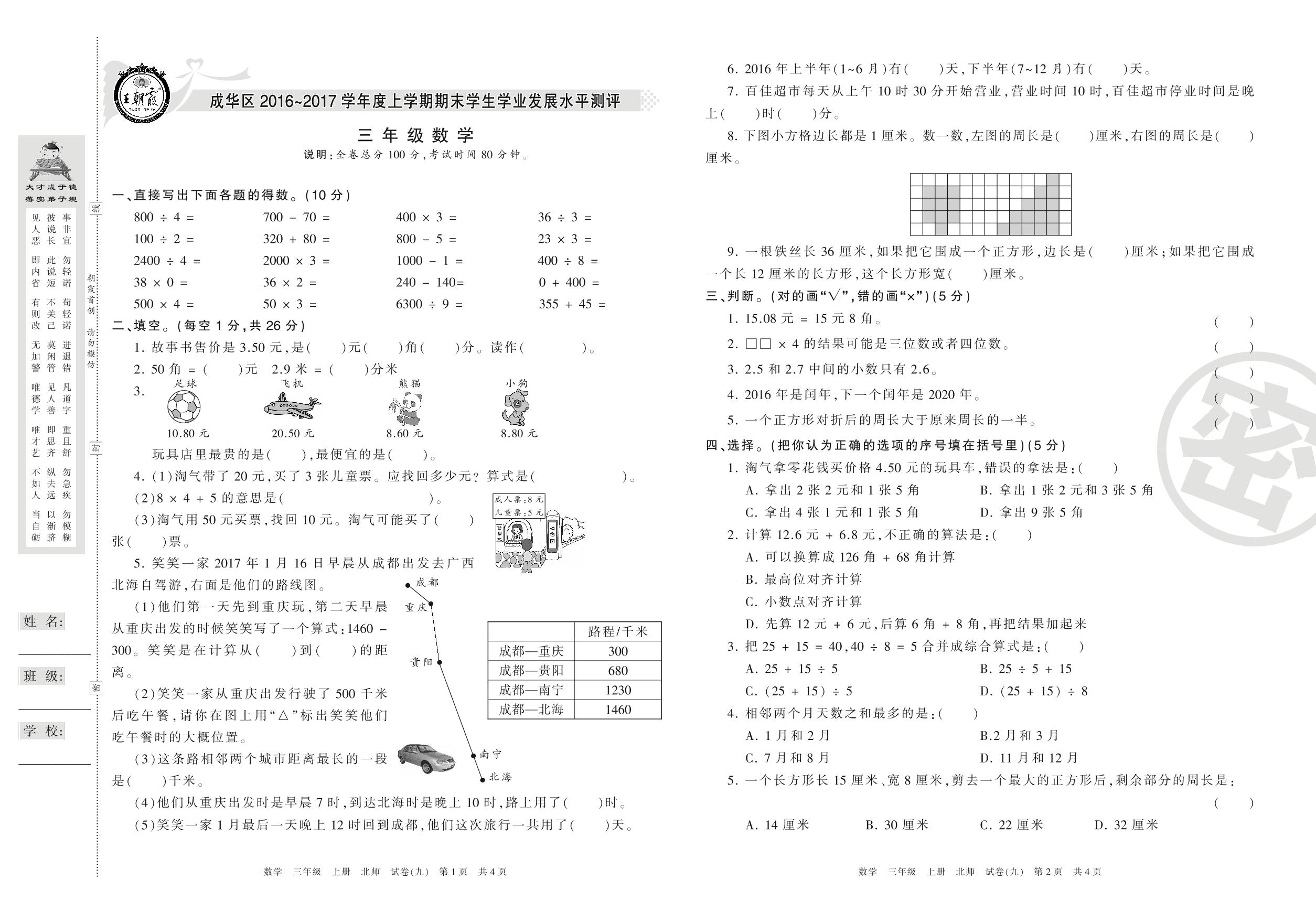 2016-2017学年第一学期成都市成华区三年级数学试卷(北师版)【9】