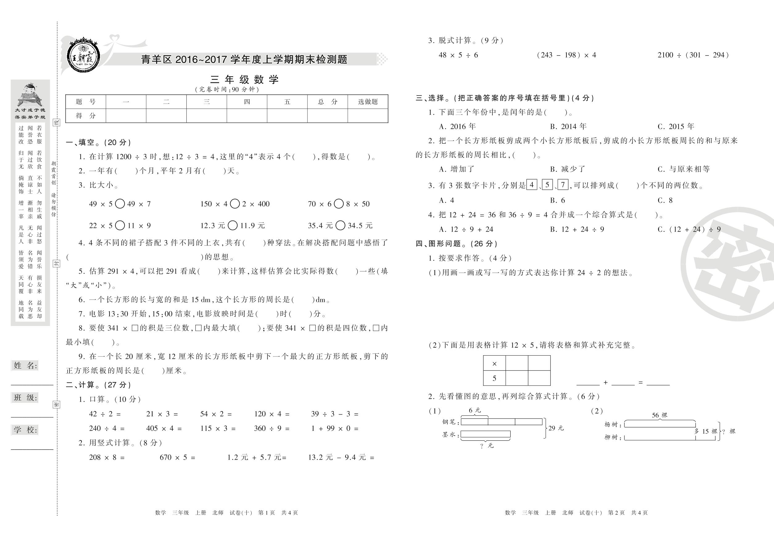 2016-2017学年第一学期成都市青羊区三年级数学试卷(北师版)【10】