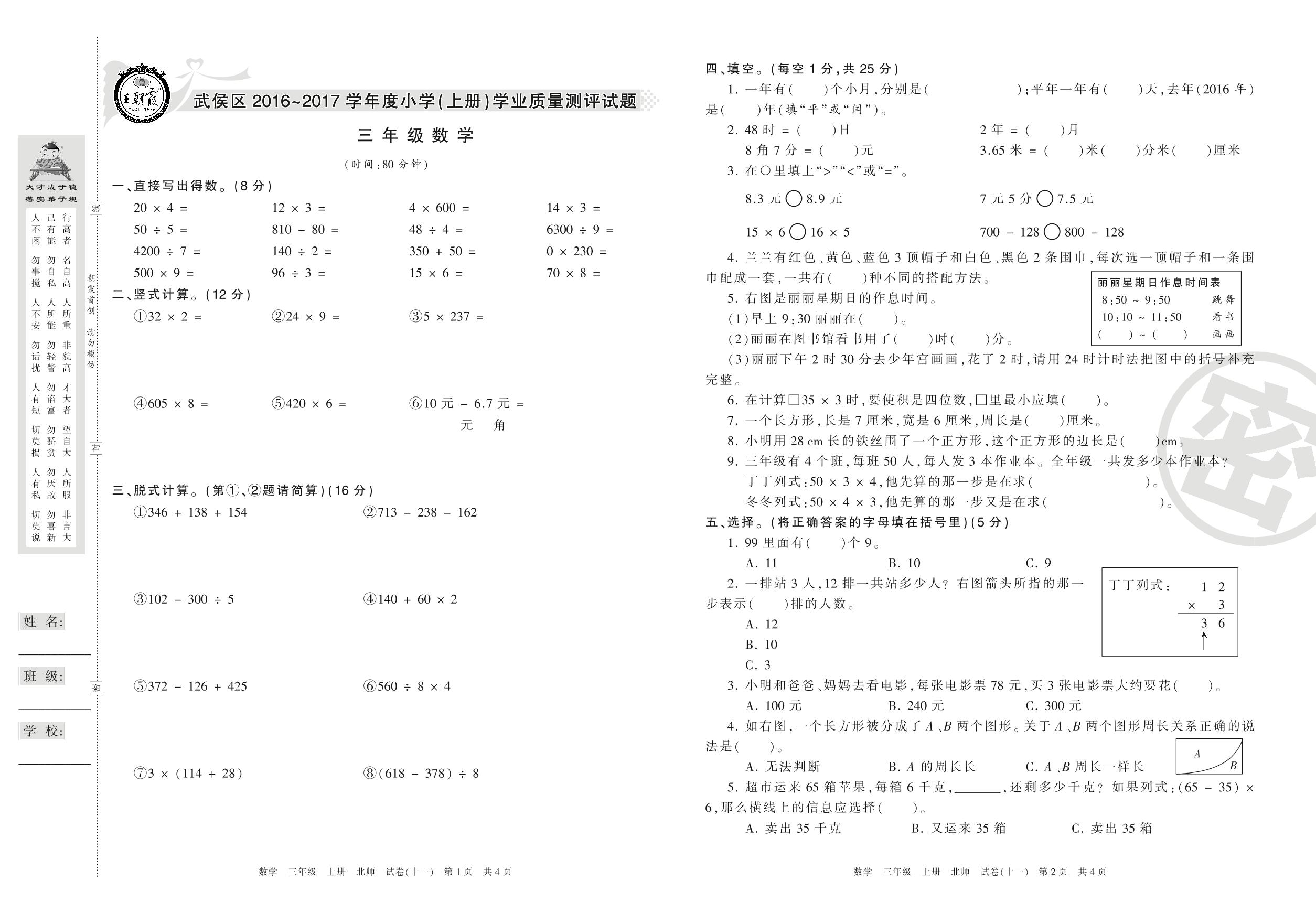 2016-2017学年第一学期成都市武侯区三年级数学试卷(北师版)【11】
