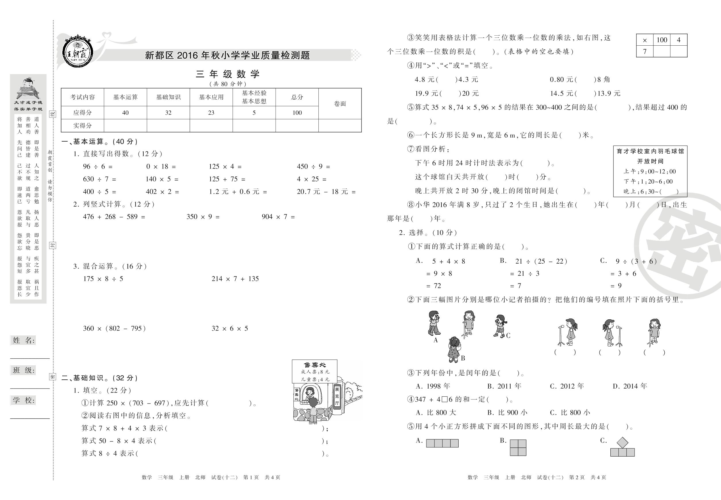 2016-2017学年第一学期成都市新都区三年级数学试卷(北师版)【12】