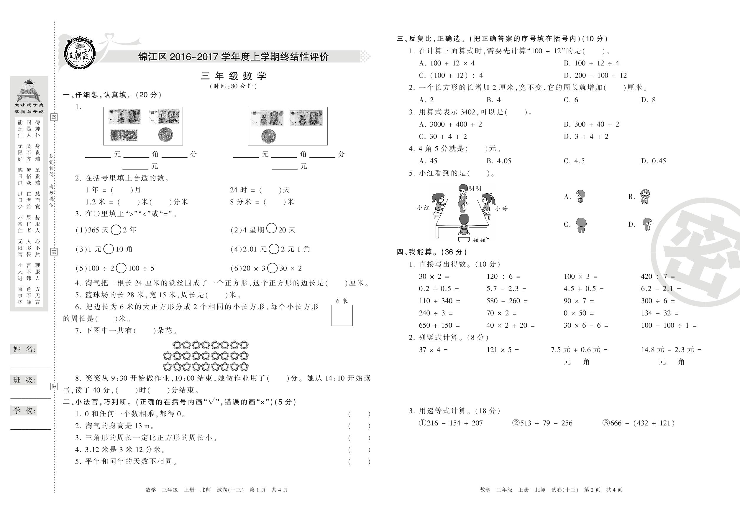 2016-2017学年第一学期成都市锦江区三年级数学试卷(北师版)【13】