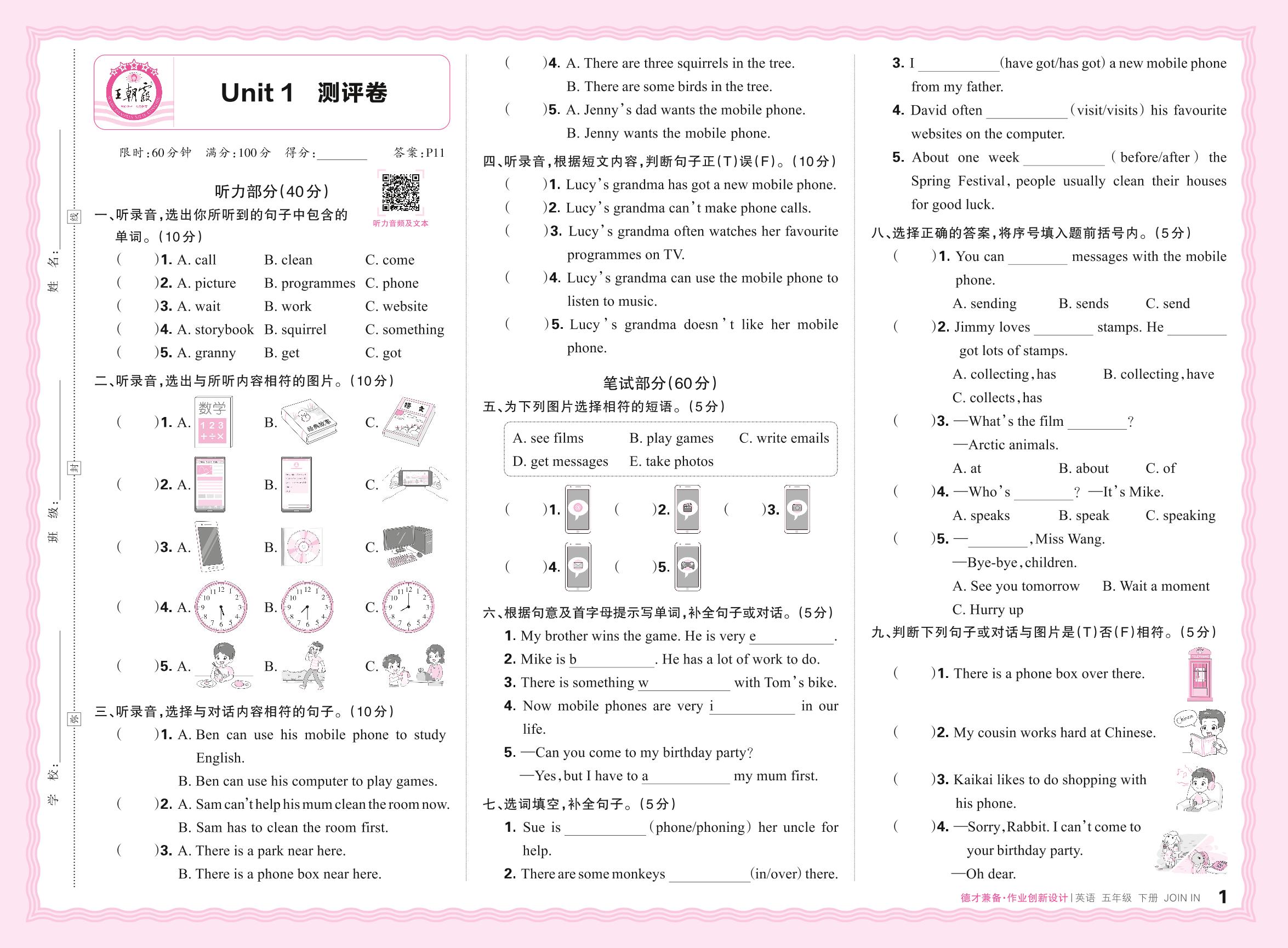 2024春下册五年级英语剑桥版 Unit 1 测评卷