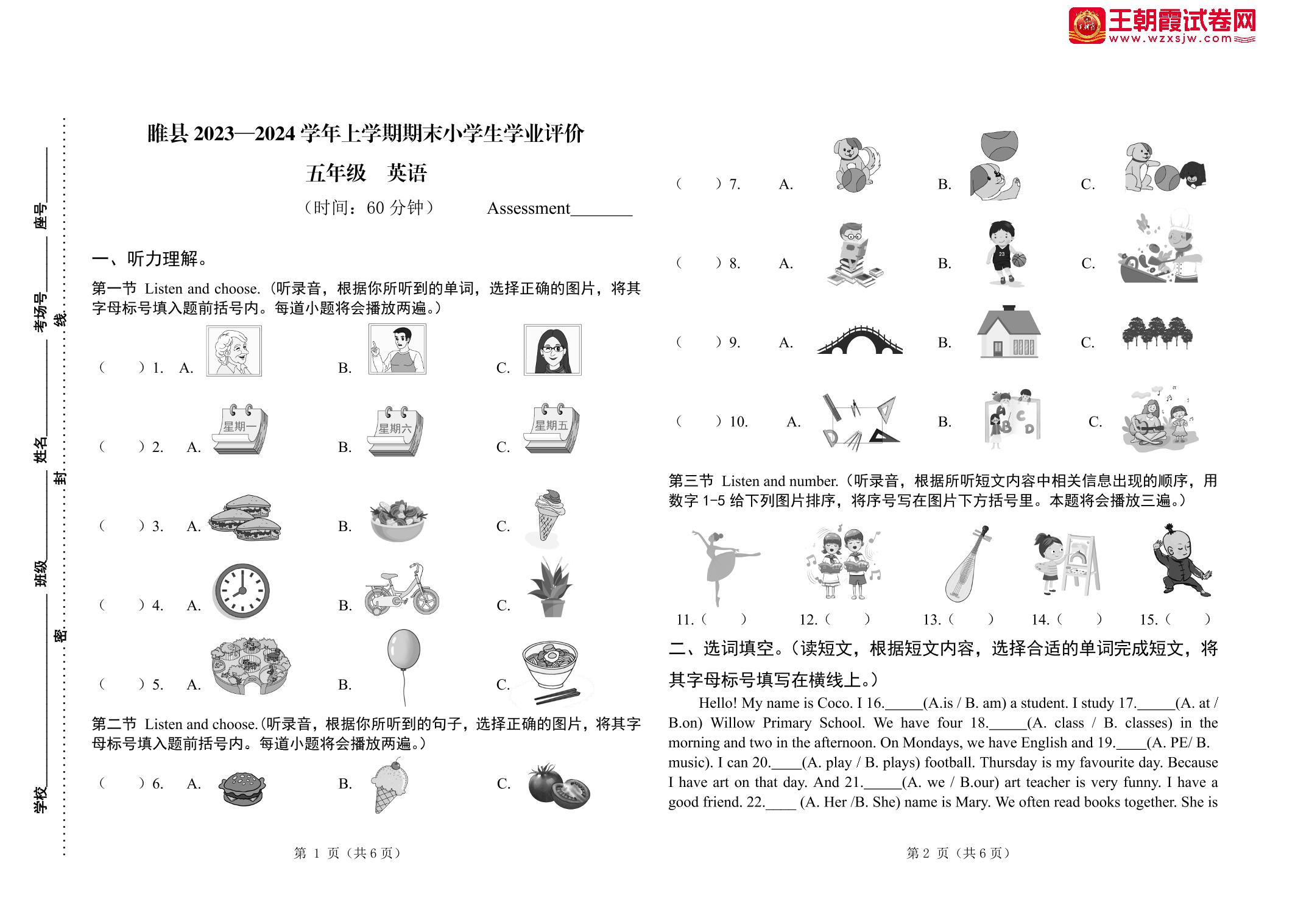 河南省商丘市睢县2023-2024学年上学期期末小学学业评价试卷五年级英语(科普版)【无听力音频】