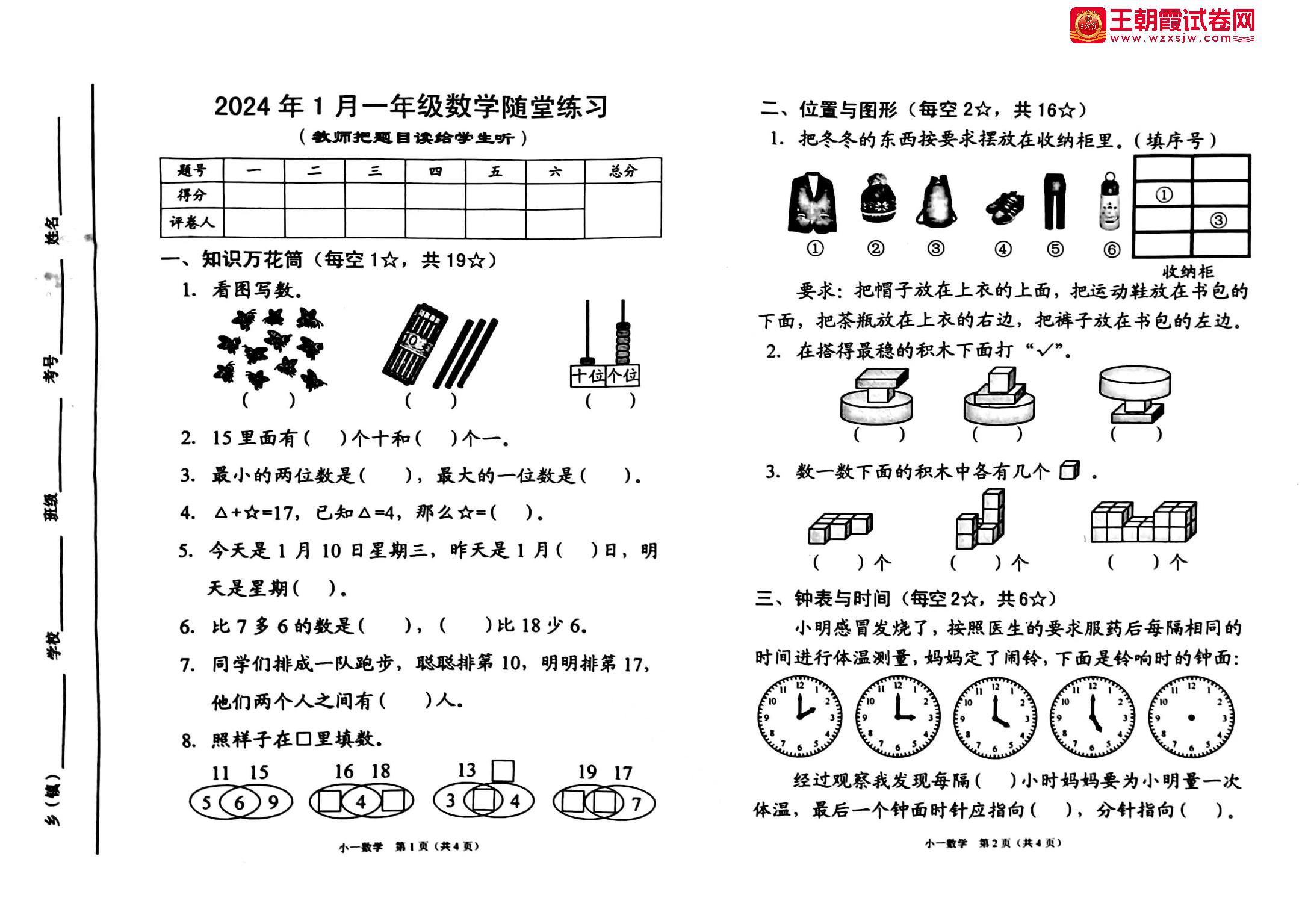 河南省南阳市宛城区2023-2024学年上学期1月期末随堂练习一年级数学(人教版)