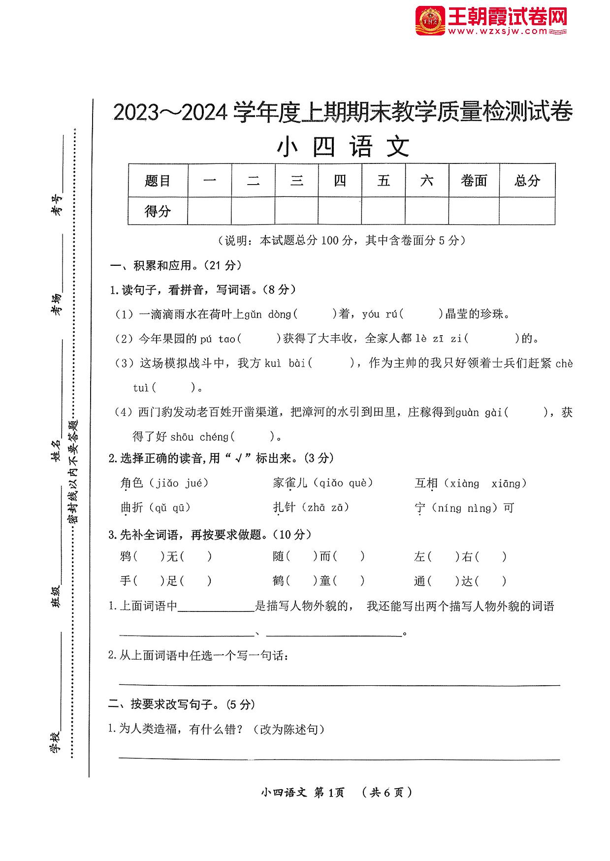 河南省漯河市郾城区2023-2024学年度上期期末教学质量检测试卷四年级语文(人教版)