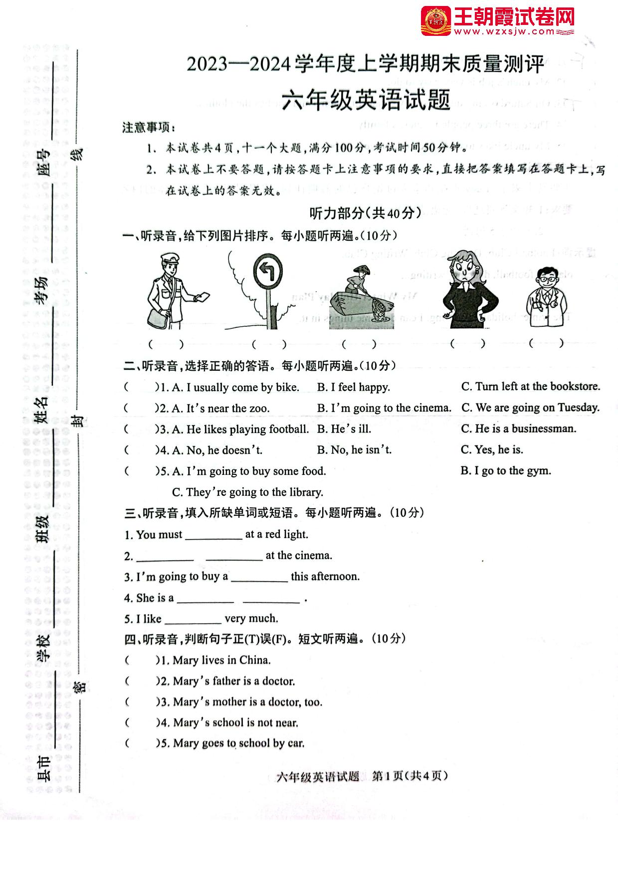 河南省周口市2023-2024学年度上学期期末质量测评试题六年级英语(人教PEP版)【无听力音频】