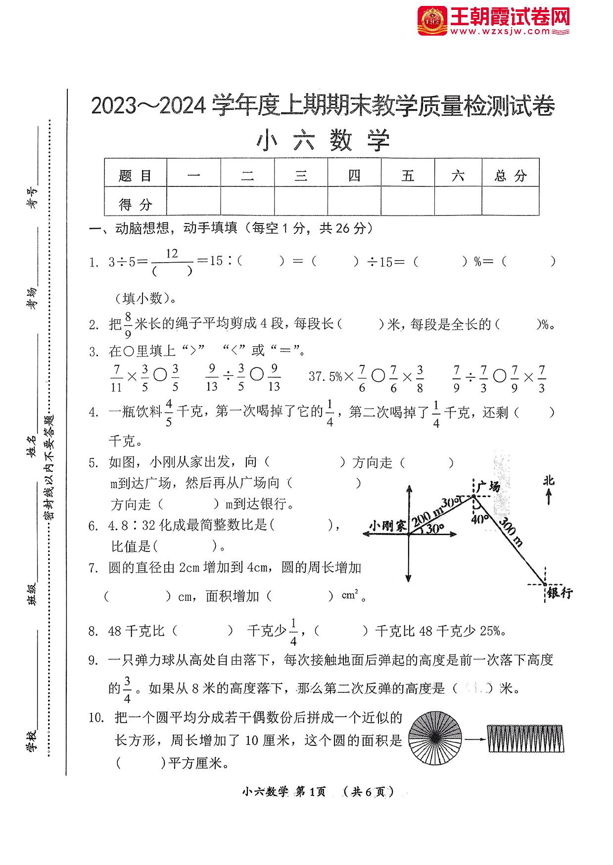 河南省漯河市郾城区2023-2024学年度上期期末教学质量检测试卷六年级数学(人教版)