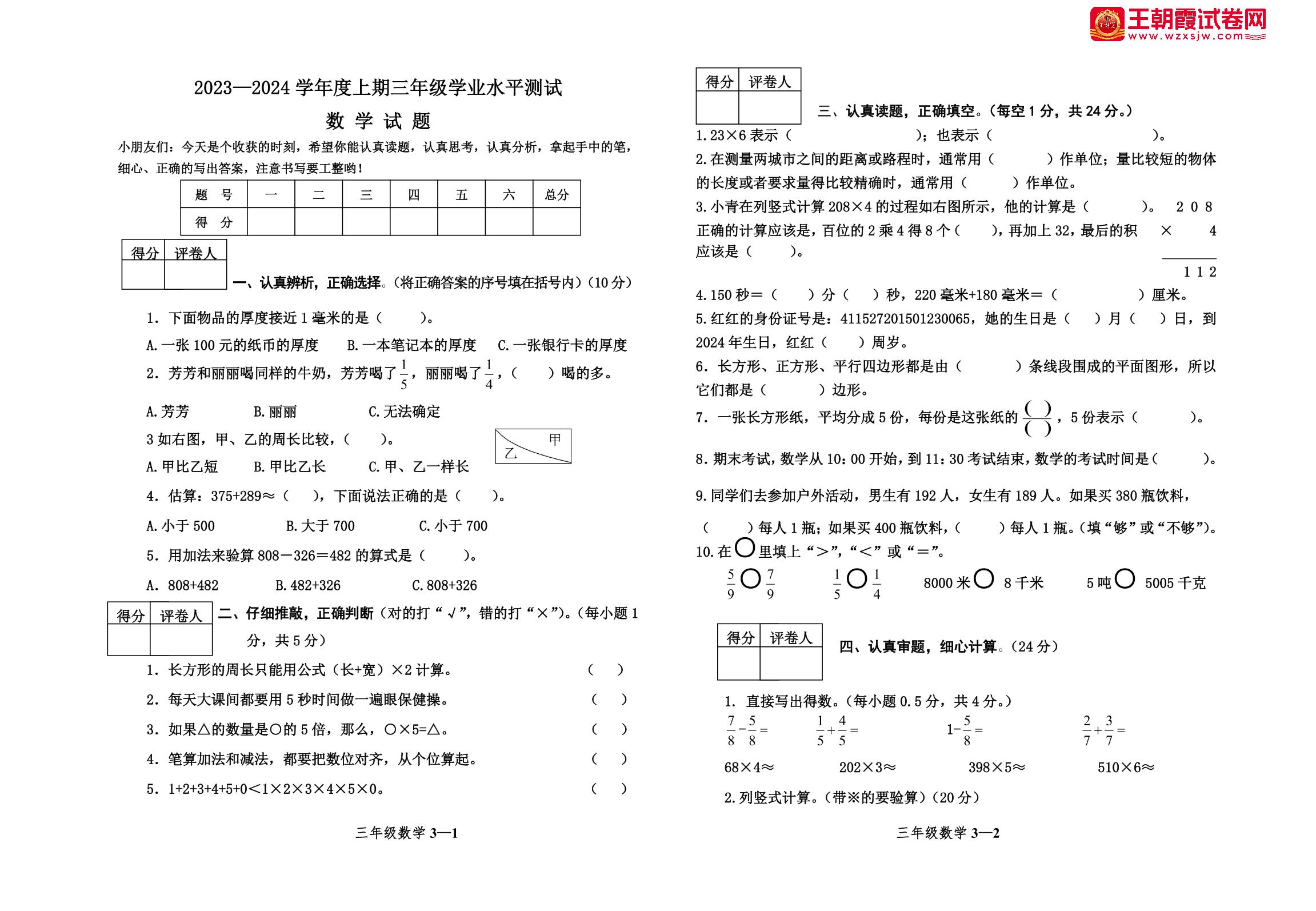 河南省信阳市淮滨县2023-2024学年度上期期末学业水平测试试题三年级数学(人教版)