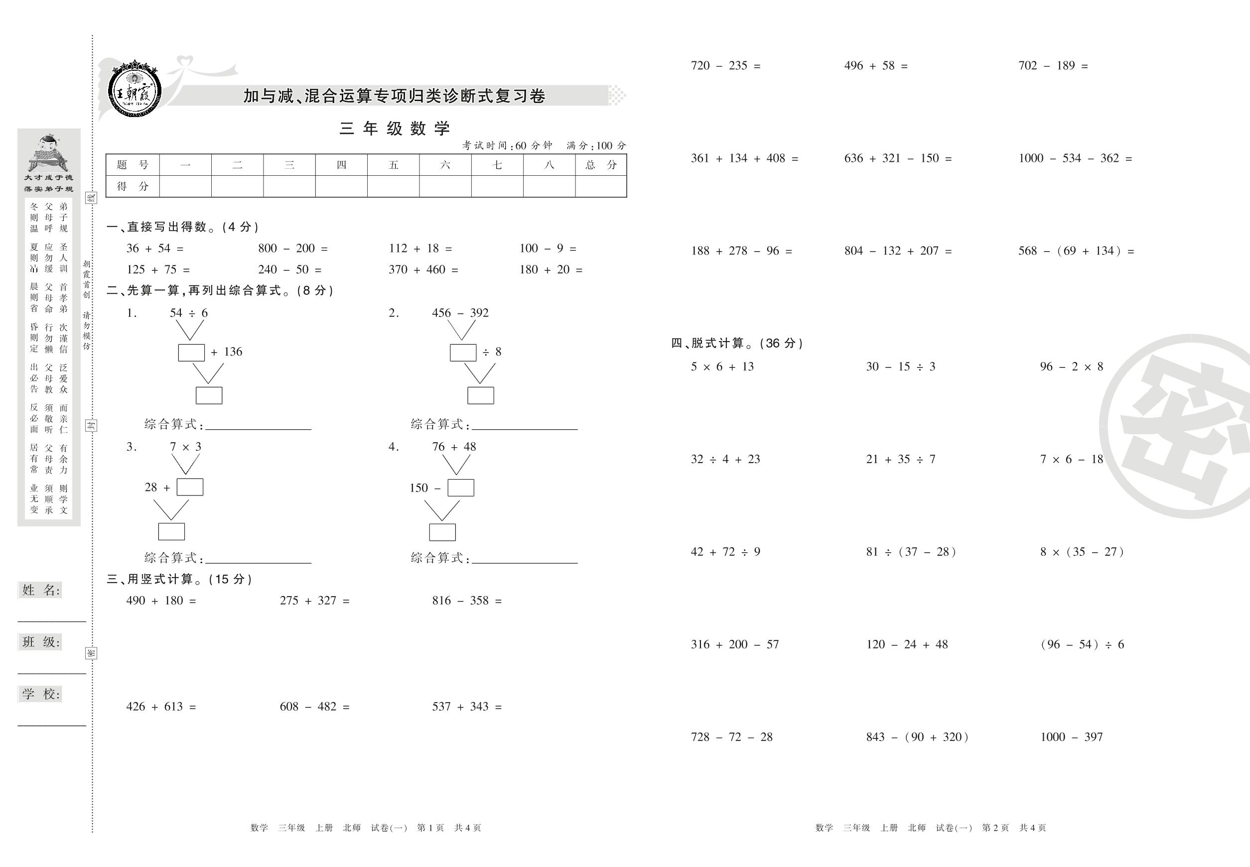 三年级数学北师版上册专项卷