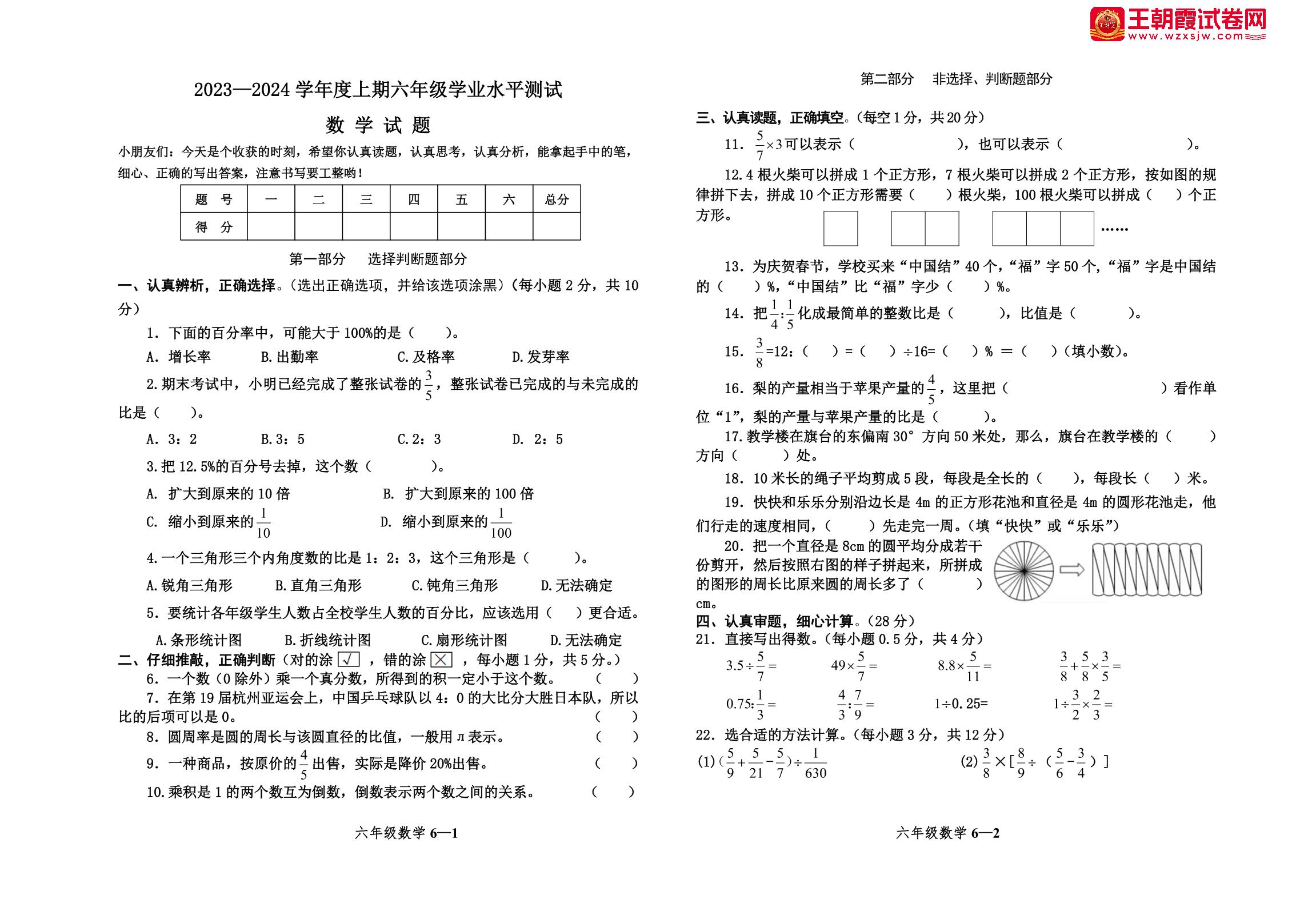 河南省信阳市淮滨县2023-2024学年度上期期末学业水平测试试题六年级数学(人教版)