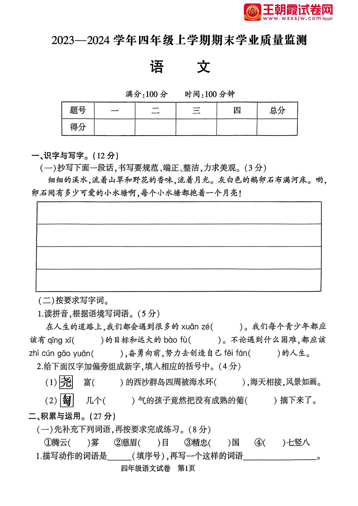 河南省信阳市浉河区2023-2024学年上学期期末学业质量监测试题四年级语文(人教版)