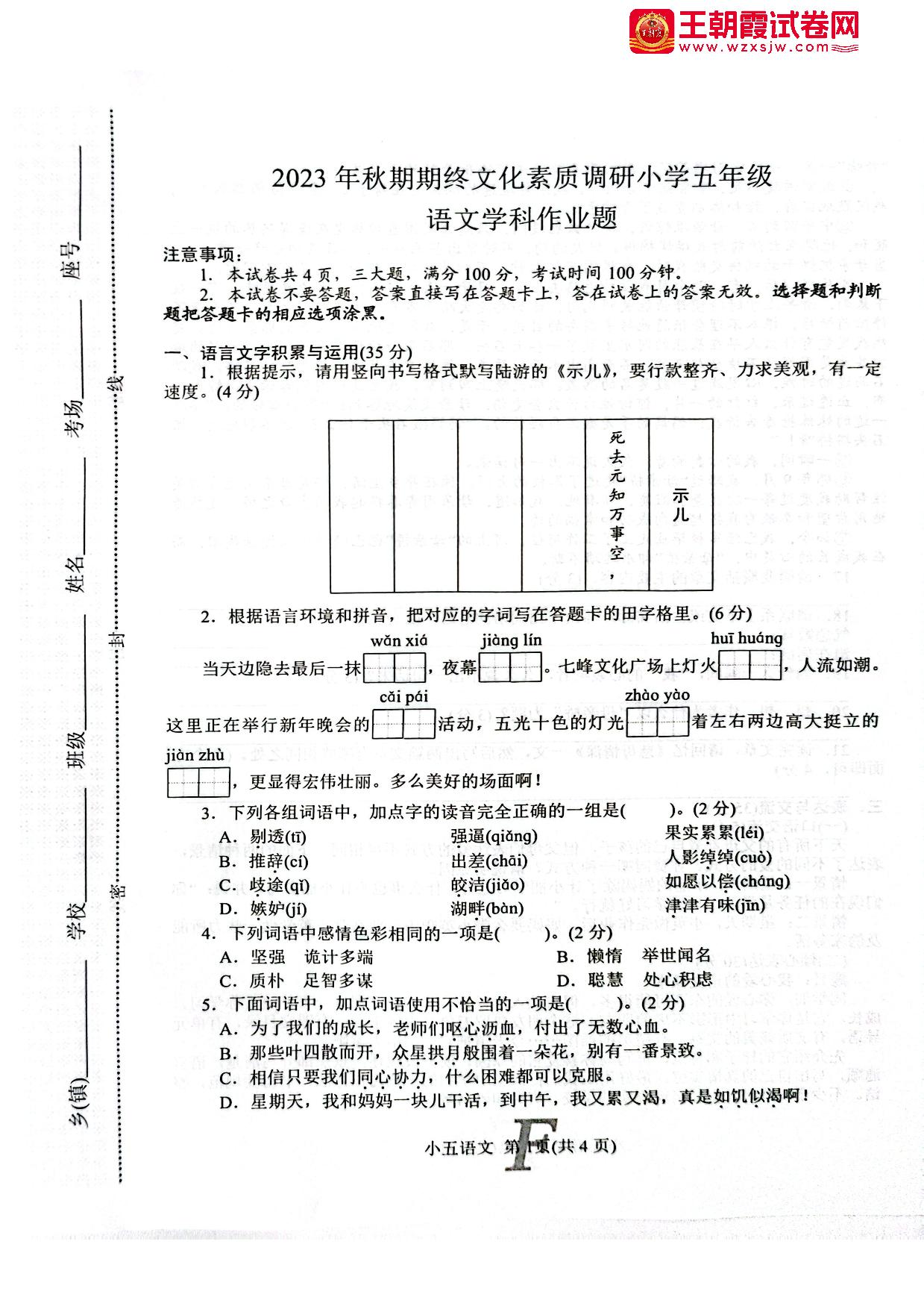 河南省南阳市方城县2023年秋期期终文化素质调研作业题五年级语文(人教版)