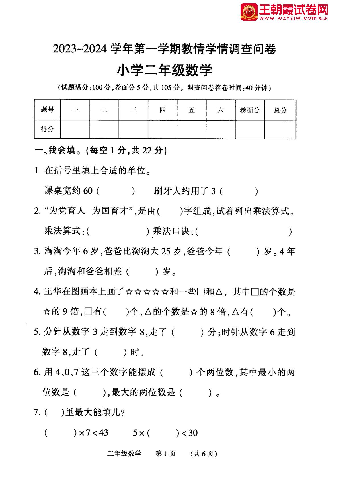 河南省濮阳市华龙区2023-2024学年第一学期期末教情学情调查问卷二年级数学(人教版)