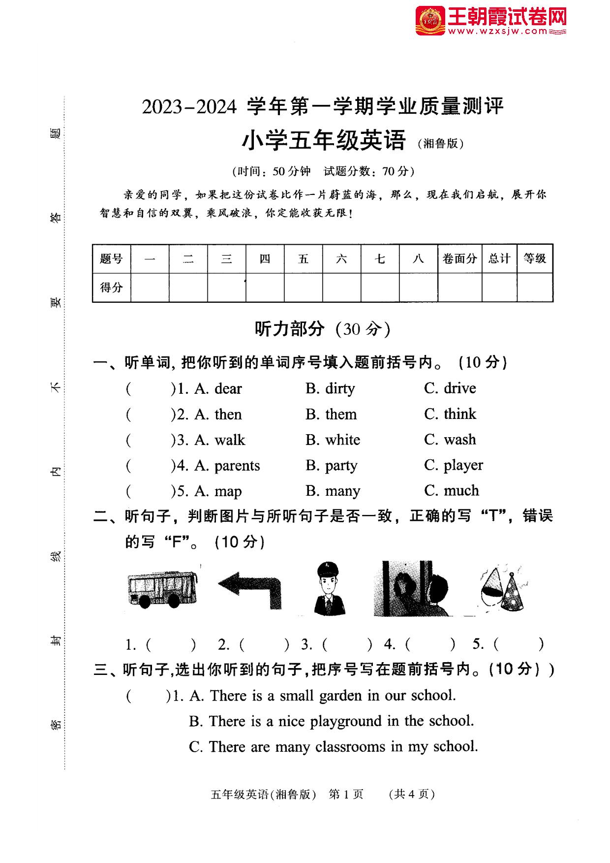 五年级英语湘鲁版上册期末卷