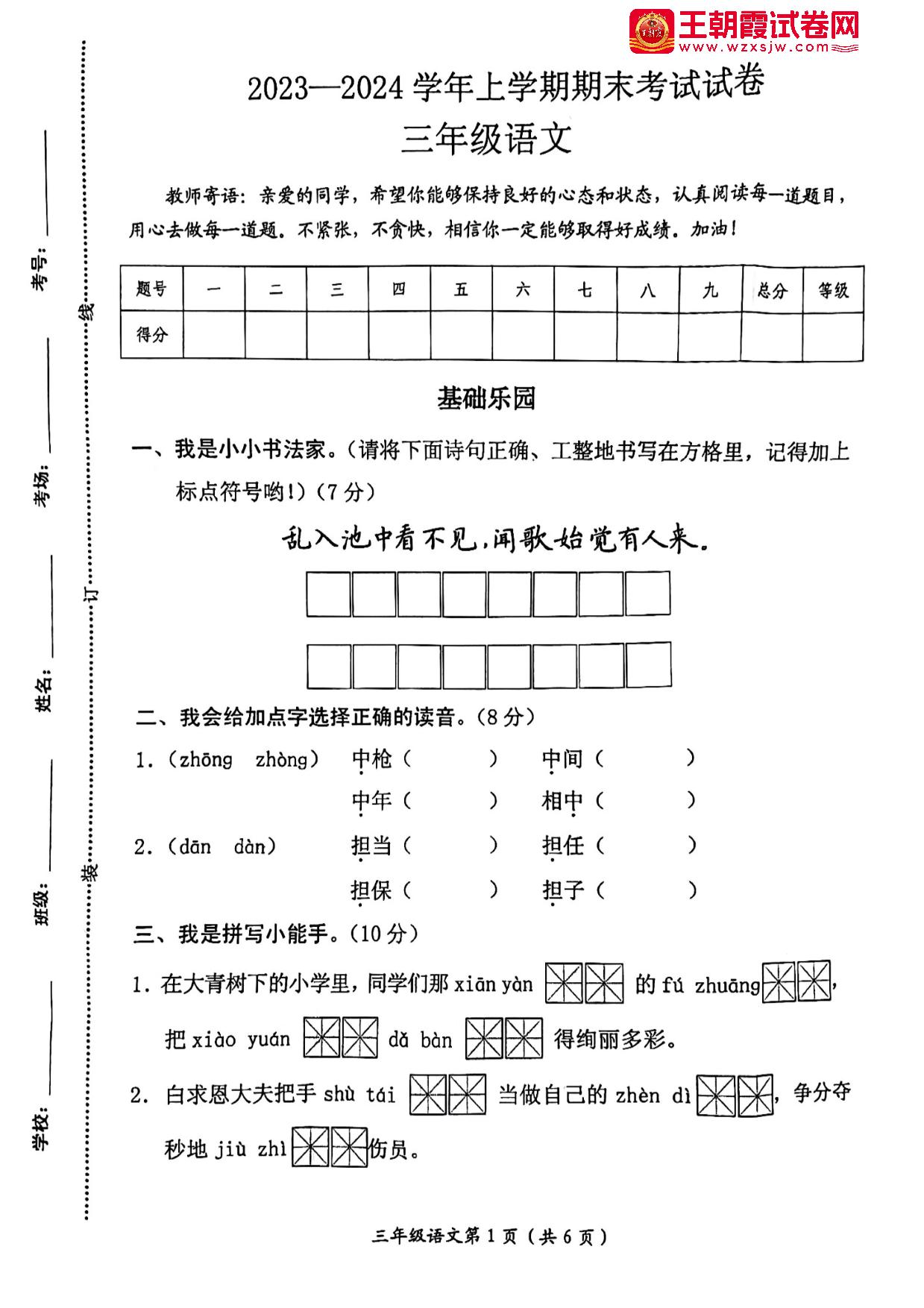 河南省新乡市长垣市2023-2024学年上学期期末考试试卷三年级语文(人教版)