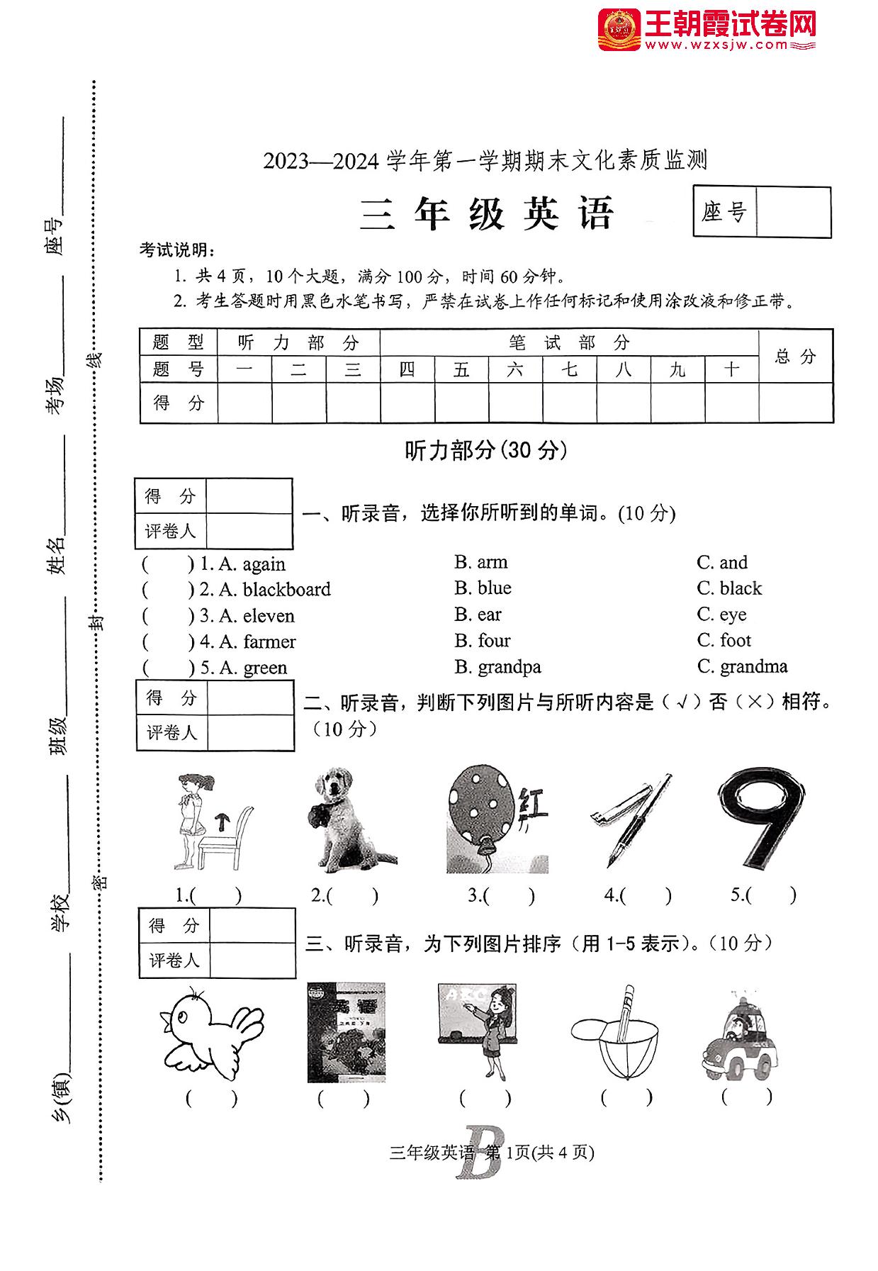 河南省平顶山市宝丰县2023-2024学年第一学期期末文化素质监测试卷三年级英语(外研版)