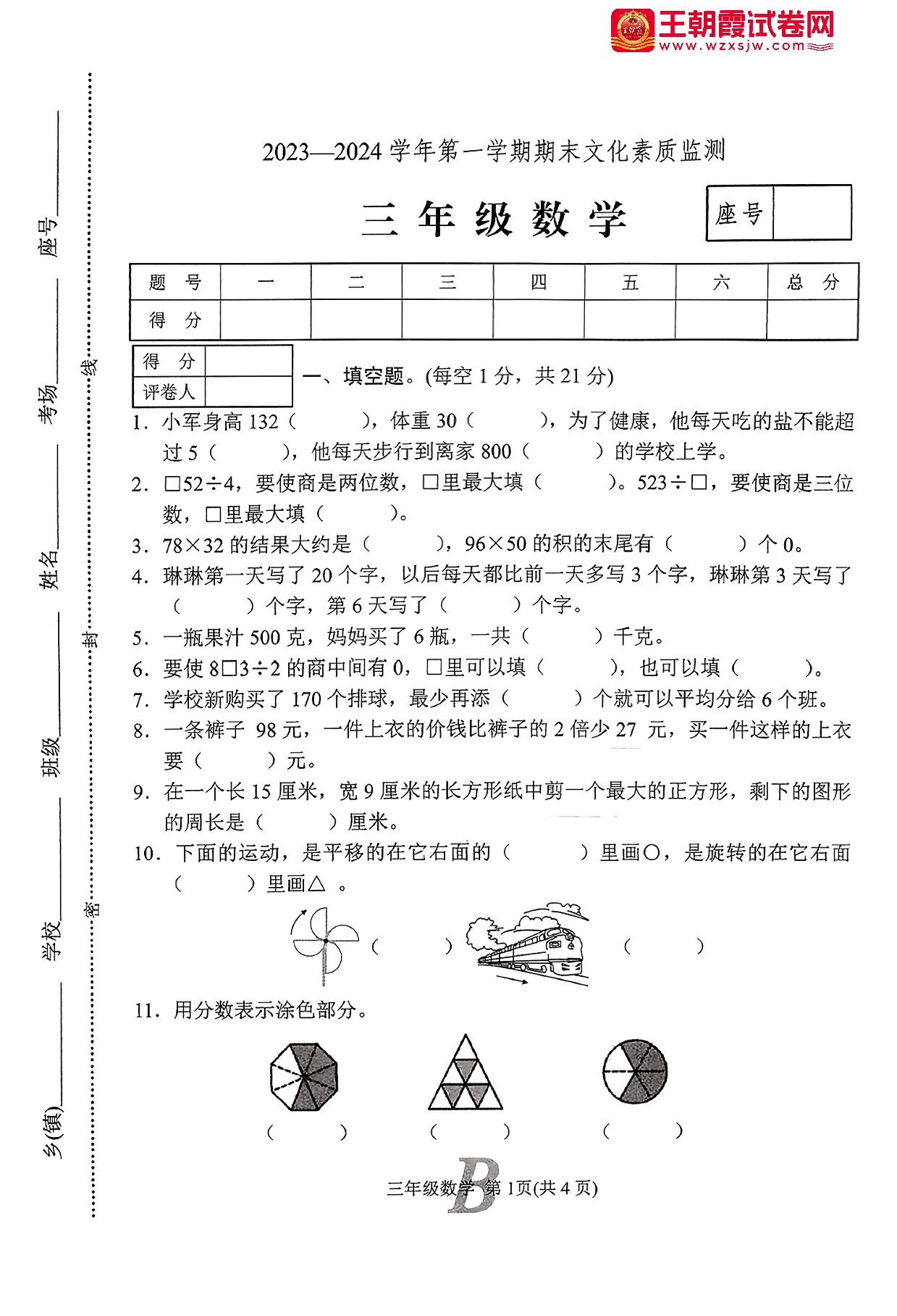 河南省平顶山市宝丰县2023-2024学年第一学期期末文化素质监测试卷三年级数学(苏教版)