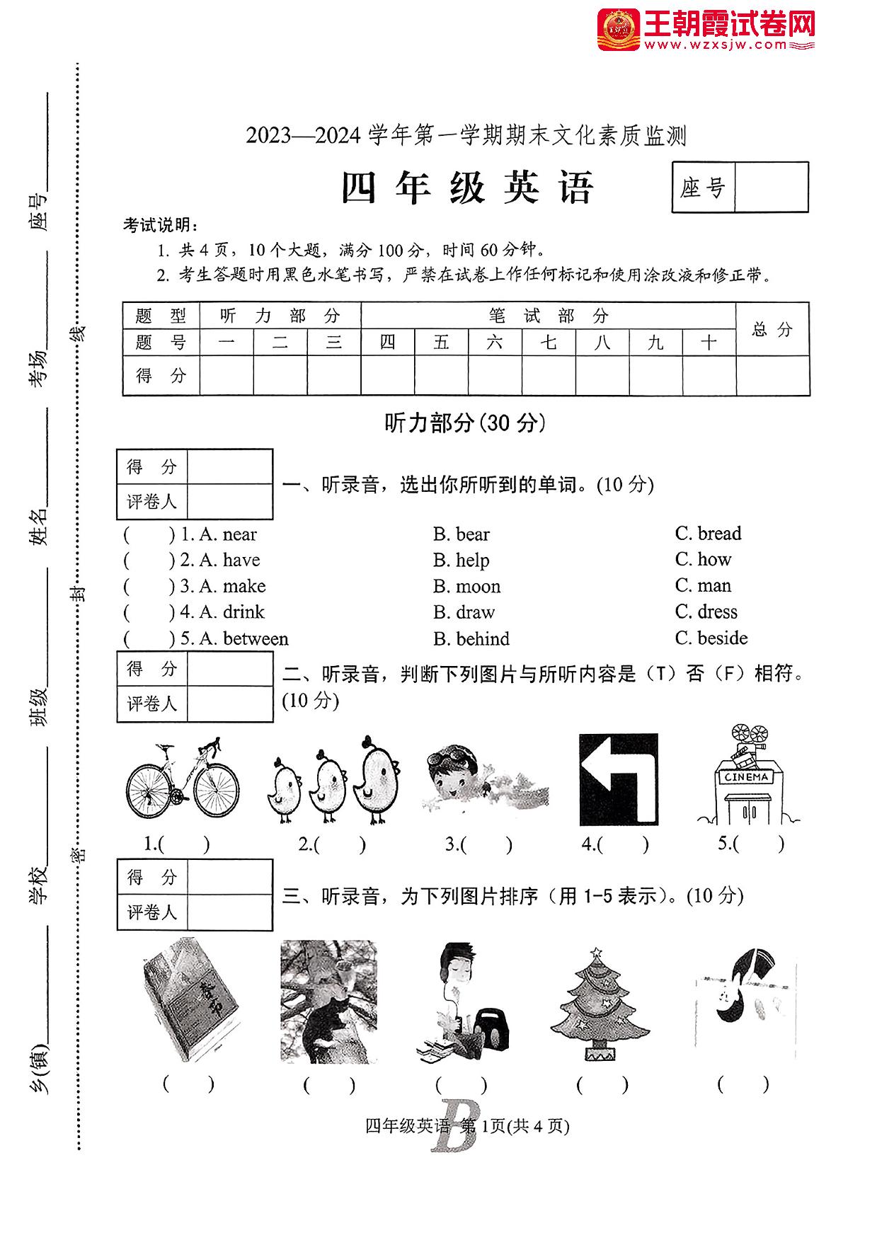 河南省平顶山市宝丰县2023-2024学年第一学期期末文化素质监测试卷四年级英语(外研版)