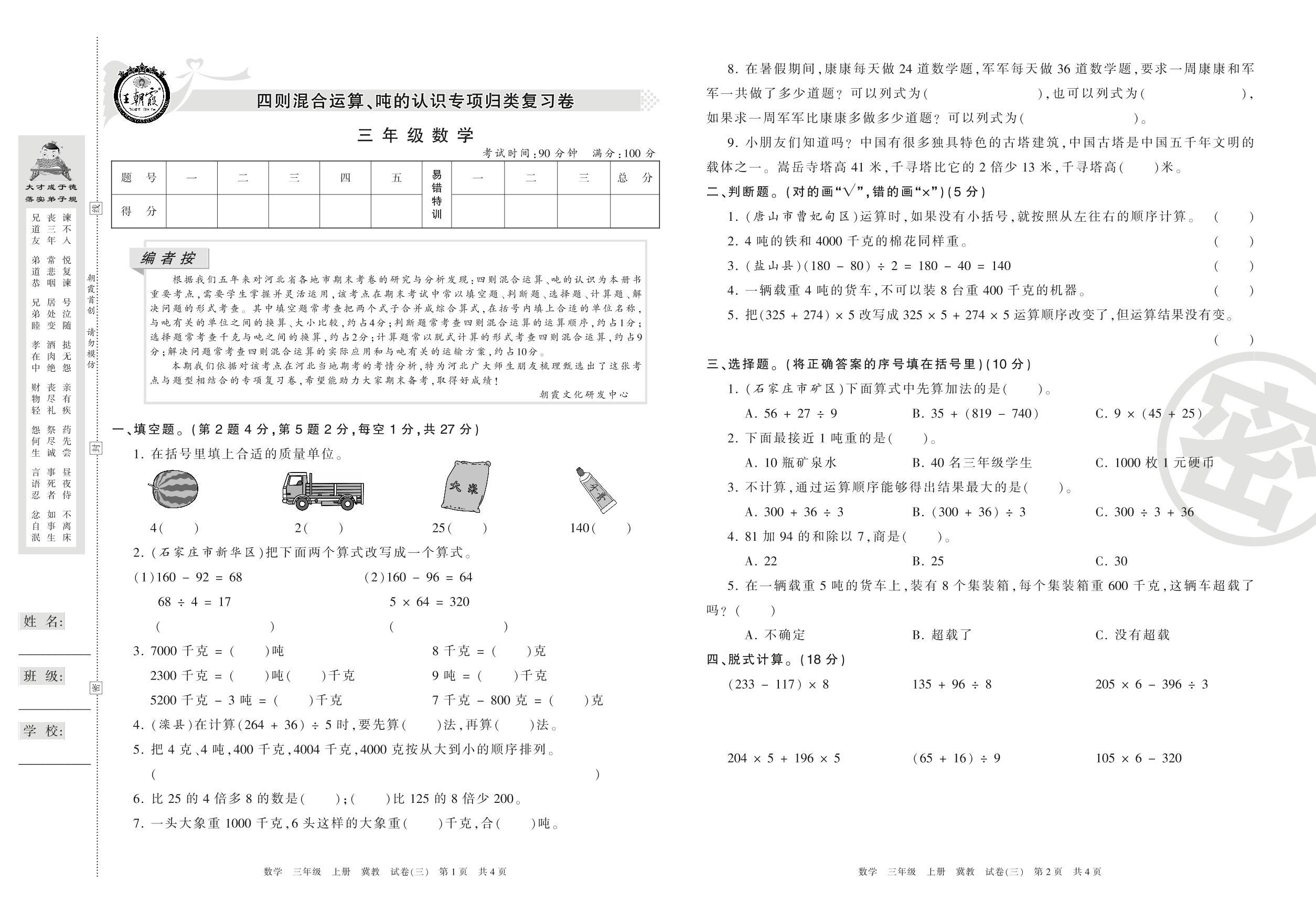 王朝霞期末专项卷三年级上册数学(冀教版)【3】