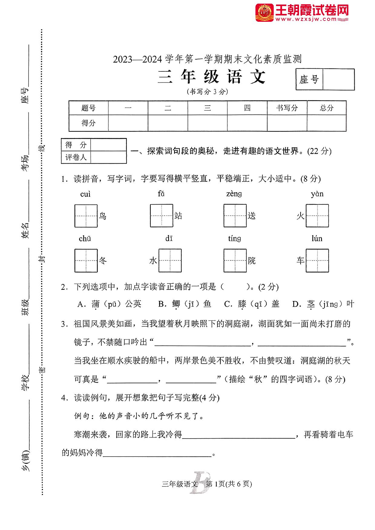 河南省平顶山市宝丰县2023-2024学年第一学期期末文化素质监测试卷三年级语文(人教版)