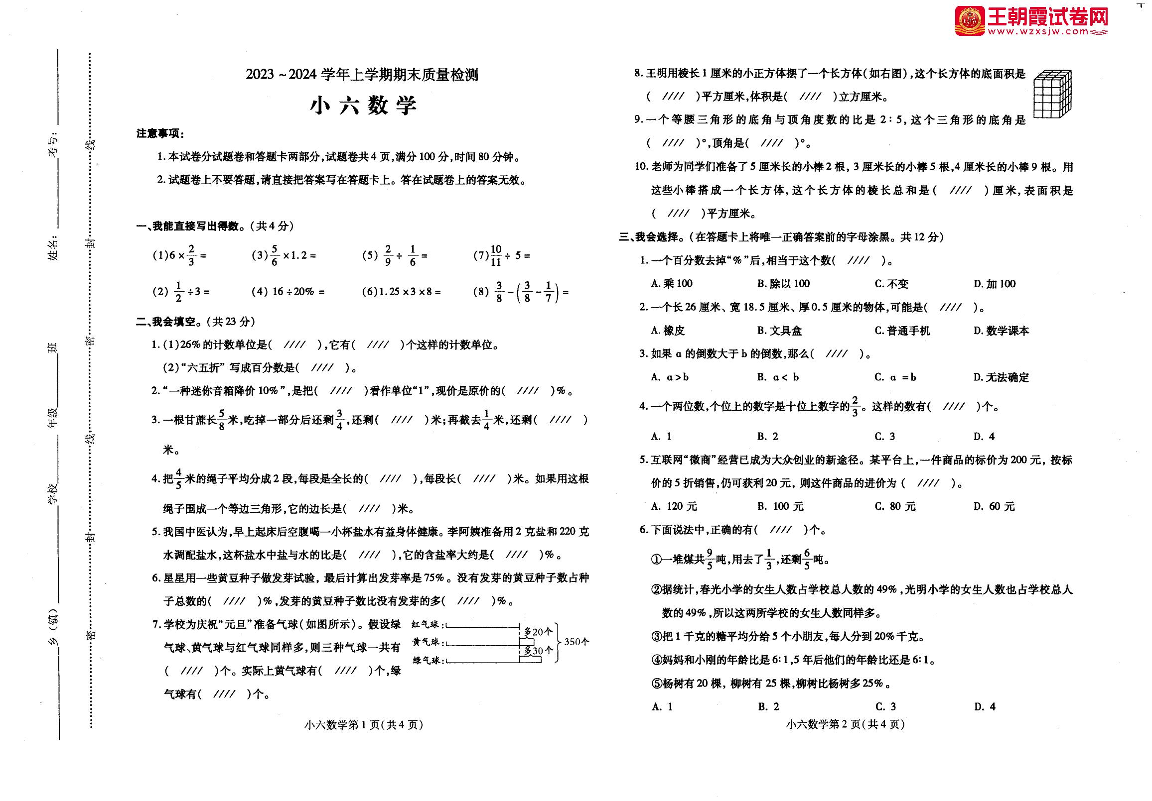 河南省平顶山市汝州市2023-2024学年上学期期末质量检测试卷六年级数学(苏教版)