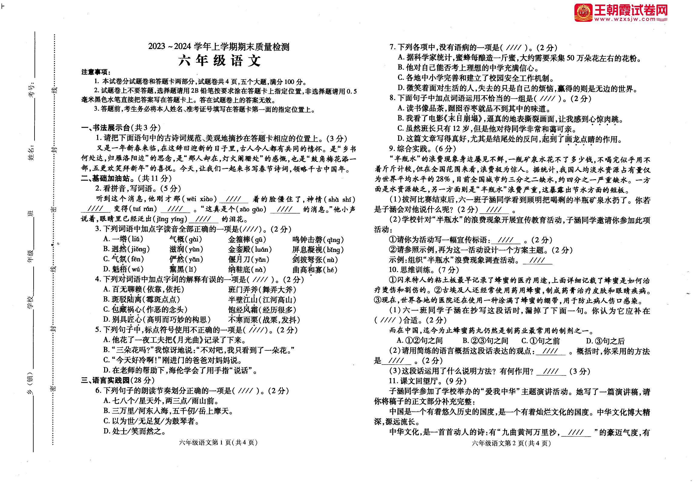 河南省平顶山市汝州市2023-2024学年上学期期末质量检测试卷六年级语文(人教版)