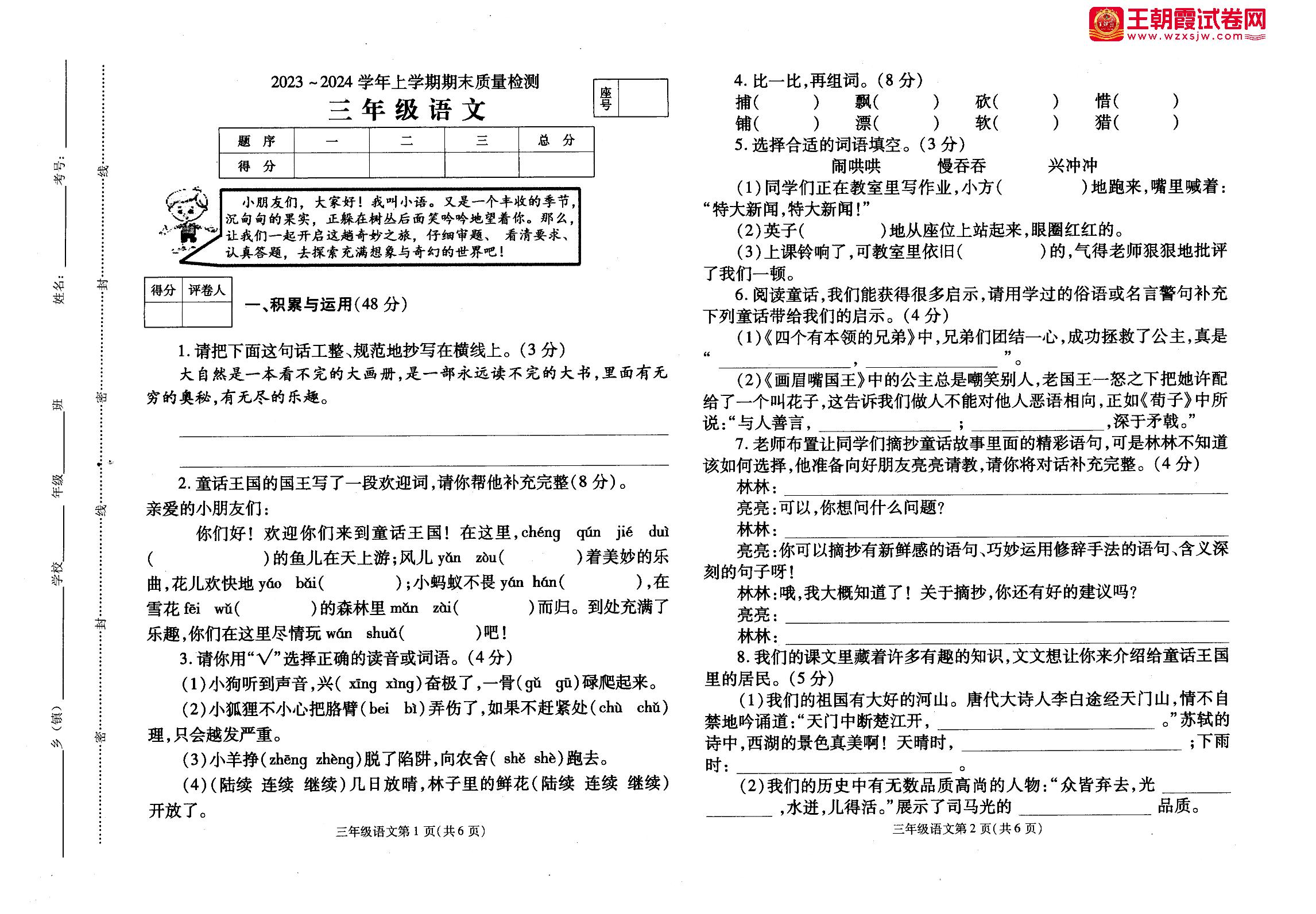河南省平顶山市汝州市2023-2024学年上学期期末质量检测试卷三年级语文(人教版)