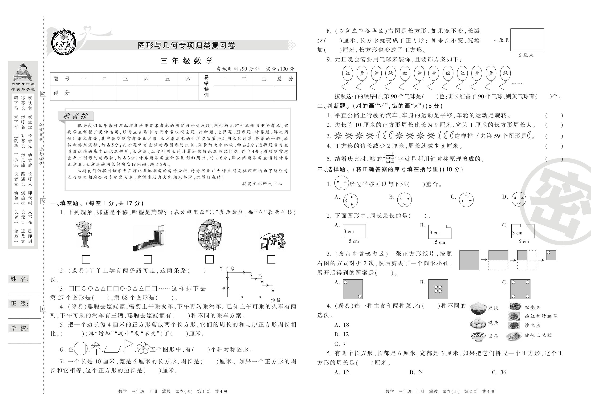 王朝霞期末专项卷三年级上册数学(冀教版)【4】