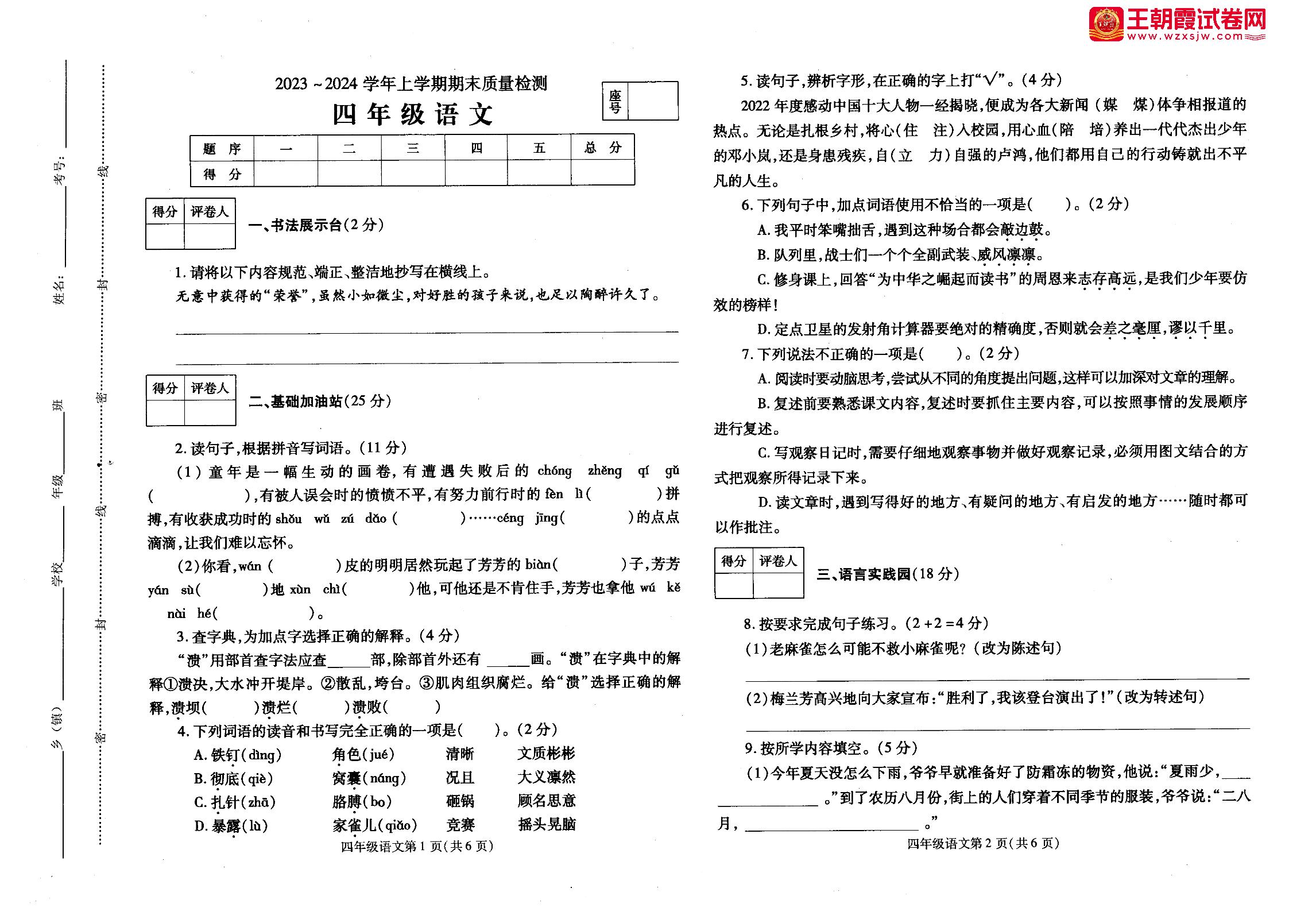 河南省平顶山市汝州市2023-2024学年上学期期末质量检测试卷四年级语文(人教版)