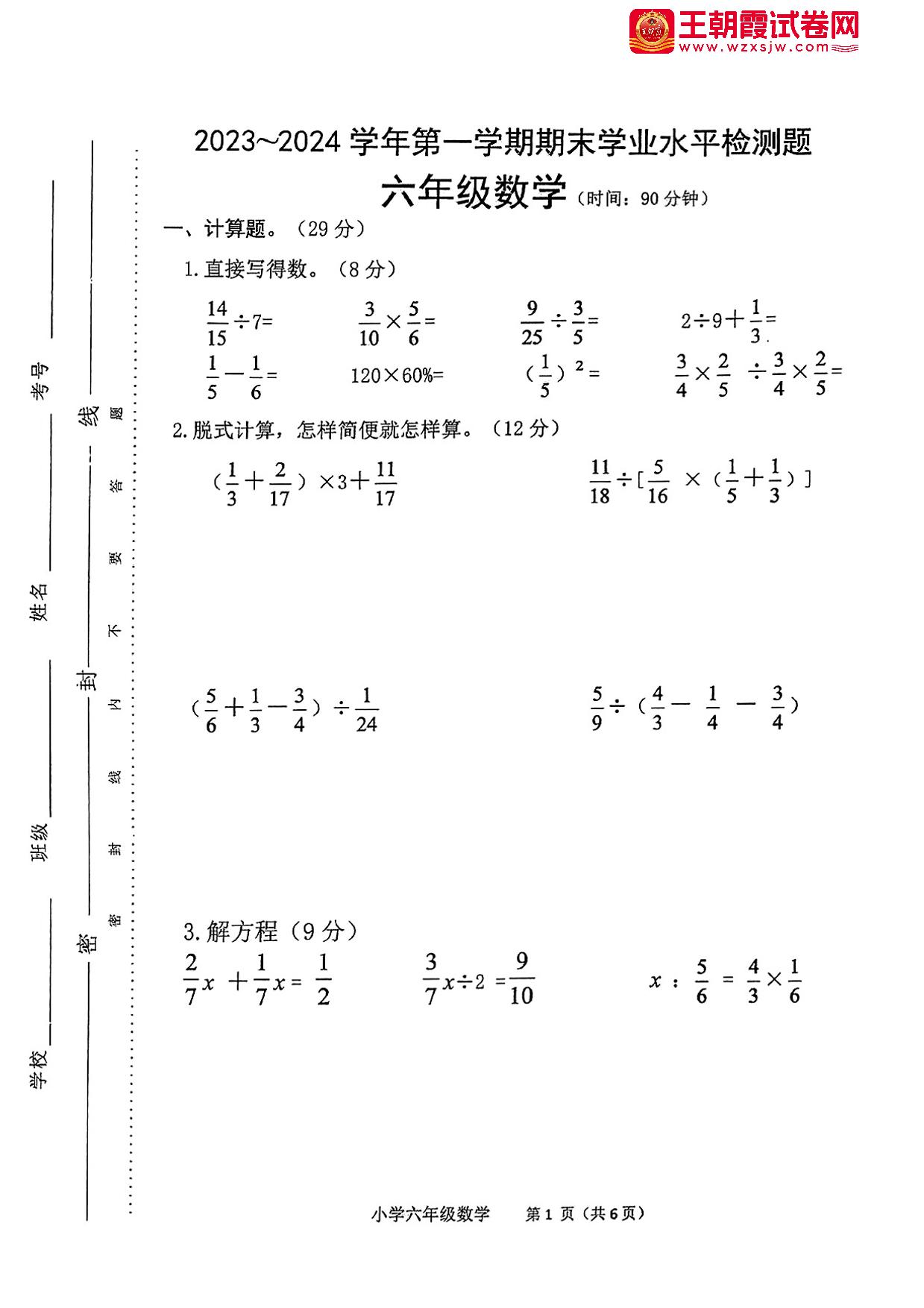 河南省平顶山市湛河区2023-2024学年第一学期期末学业水平检测题六年级数学(苏教版)