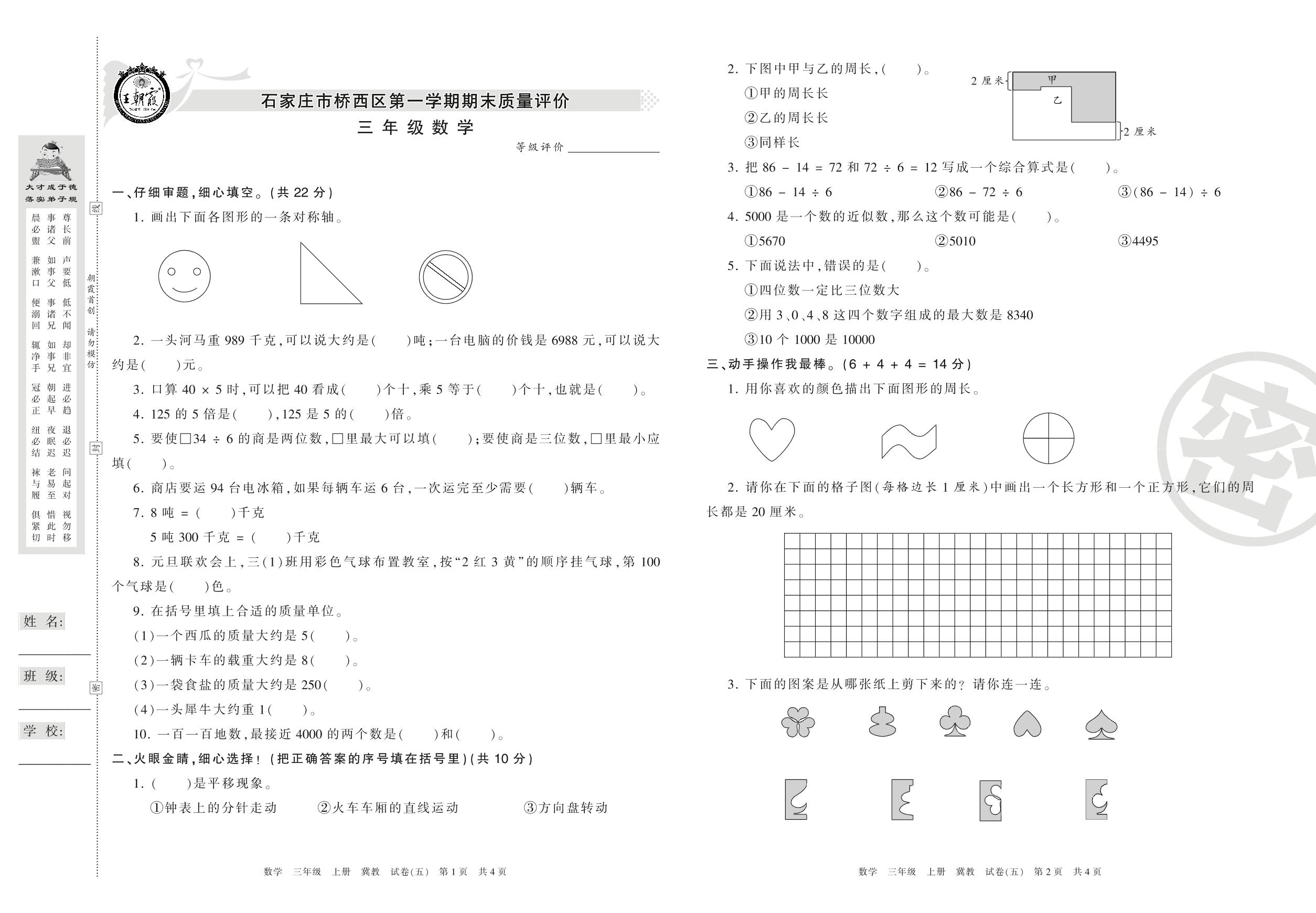 2016-2017学年第一学期石家庄市桥西区三年级数学试卷(冀教版)【5】