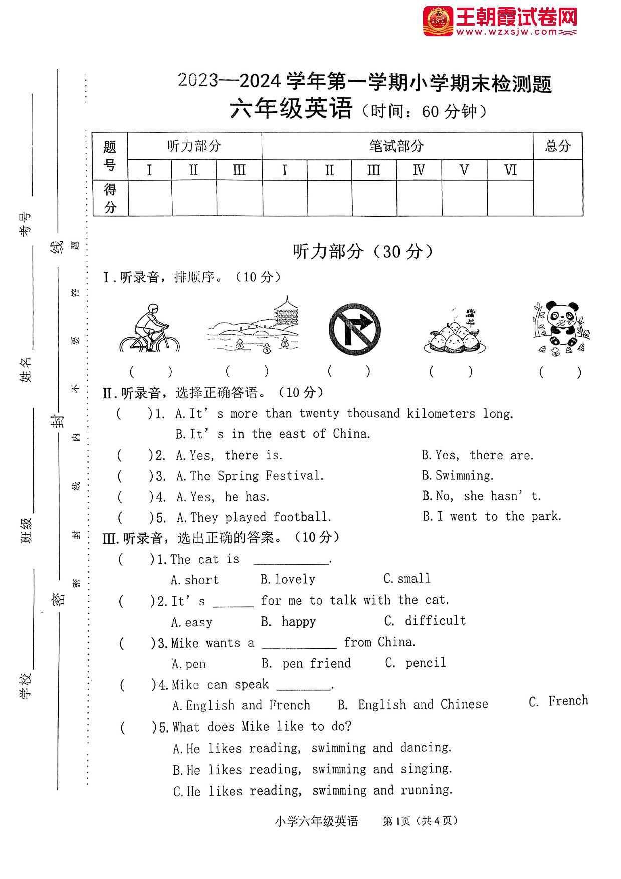 河南省平顶山市湛河区2023-2024学年第一学期小学期末测试题六年级英语(外研版)