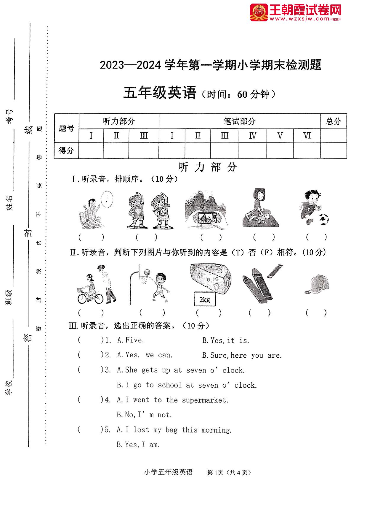 河南省平顶山市湛河区2023-2024学年第一学期小学期末测试题五年级英语(外研版)