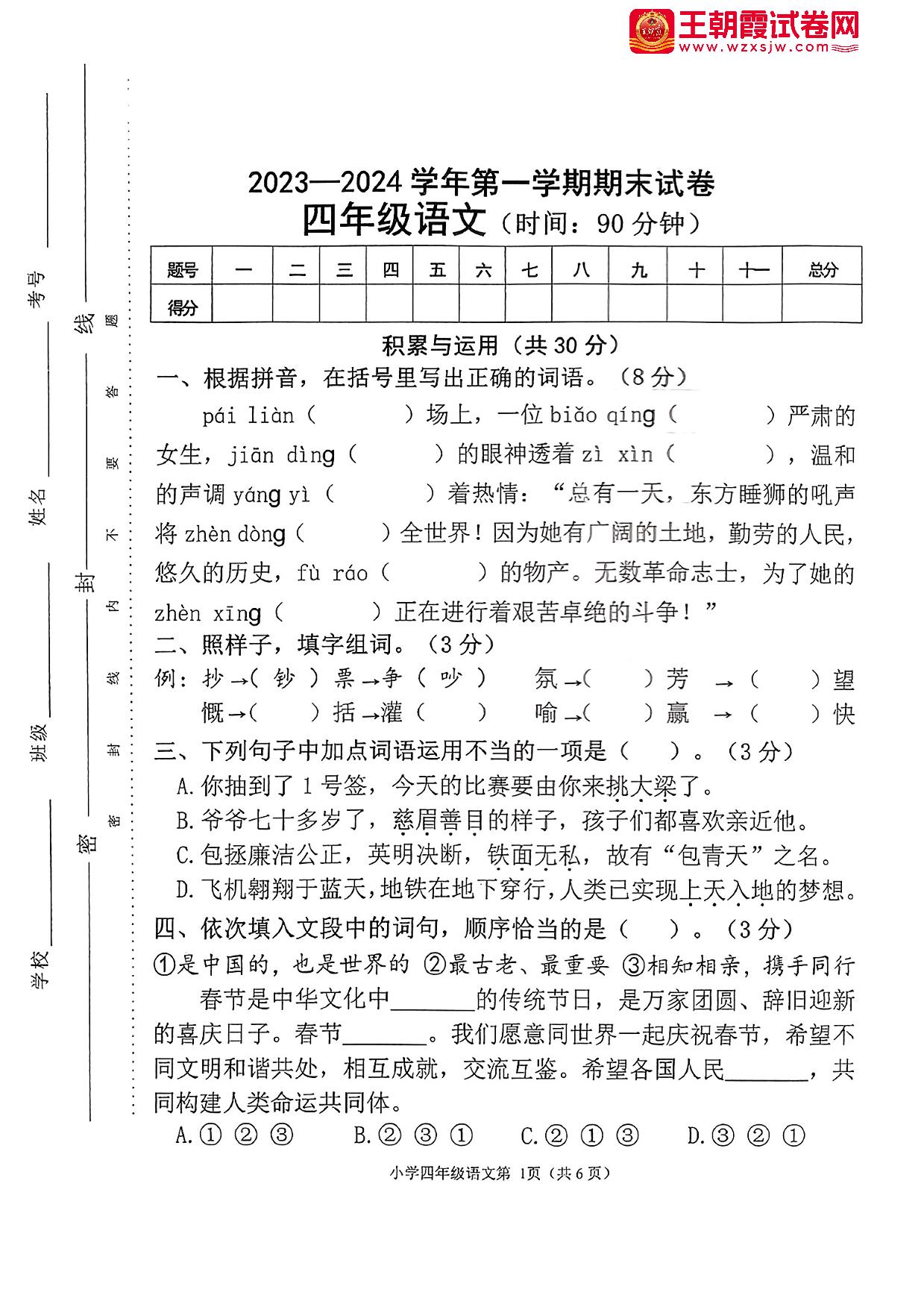 河南省平顶山市湛河区2023-2024学年第一学期期末试卷四年级语文(人教版)