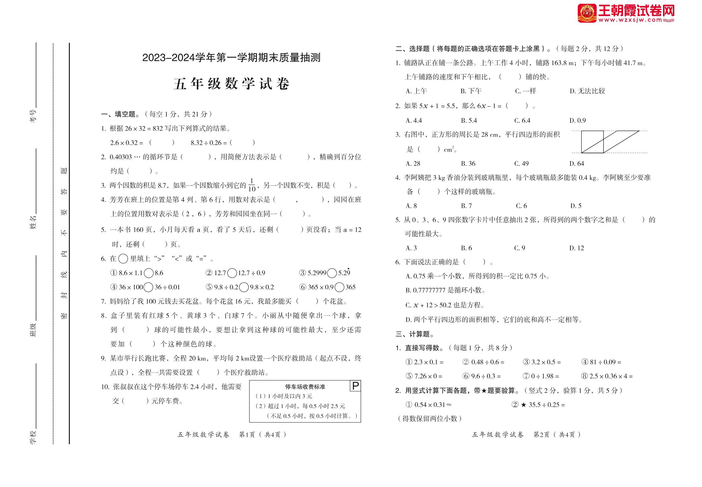 河南省安阳市殷都区2023-2024学年第一学期期末质量抽测试卷五年级数学(人教版)