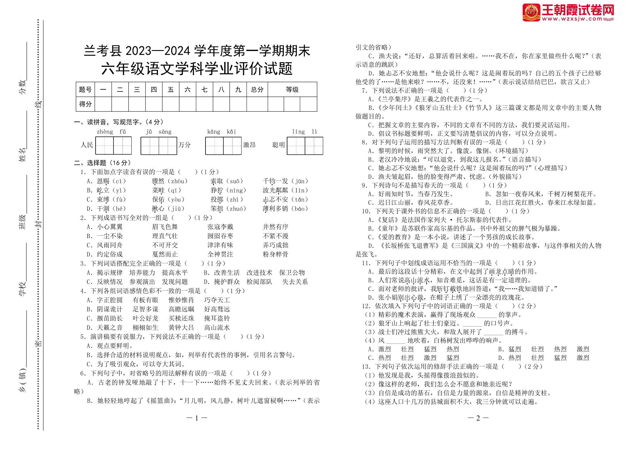 河南省开封市兰考县2023-2024学年度第一学期期末学业评价试题六年级语文(人教版)