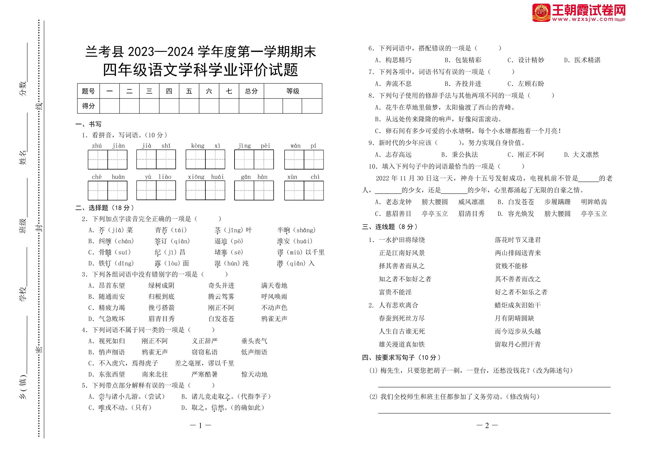 河南省开封市兰考县2023-2024学年度第一学期期末学业评价试题四年级语文(人教版)