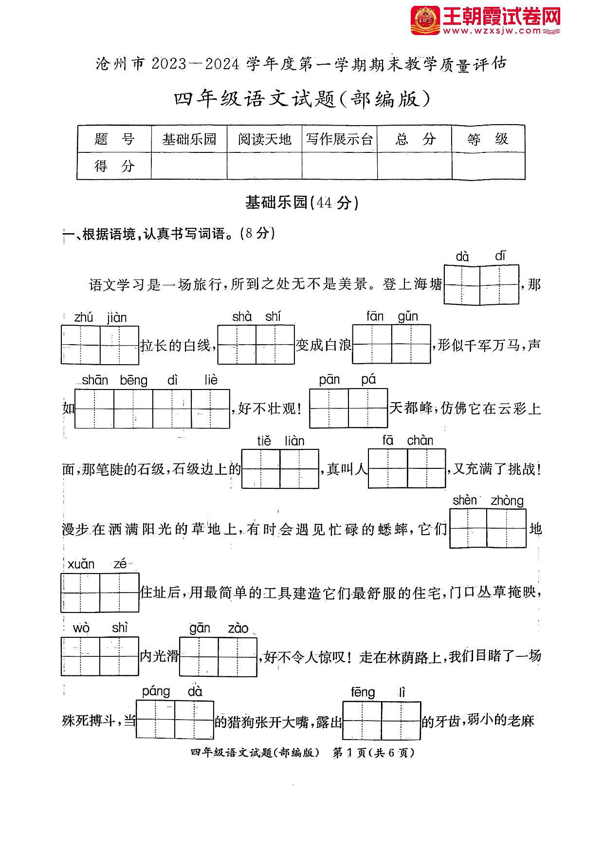 河北省沧州市2023-2024学年度第一学期期末教学质量评估试题四年级语文(人教版)