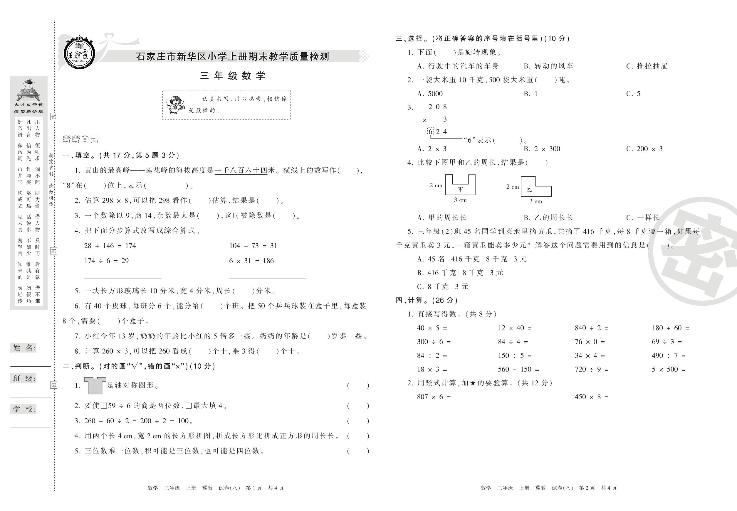 2016-2017学年第一学期石家庄市新华区三年级数学试卷(冀教版)【8】