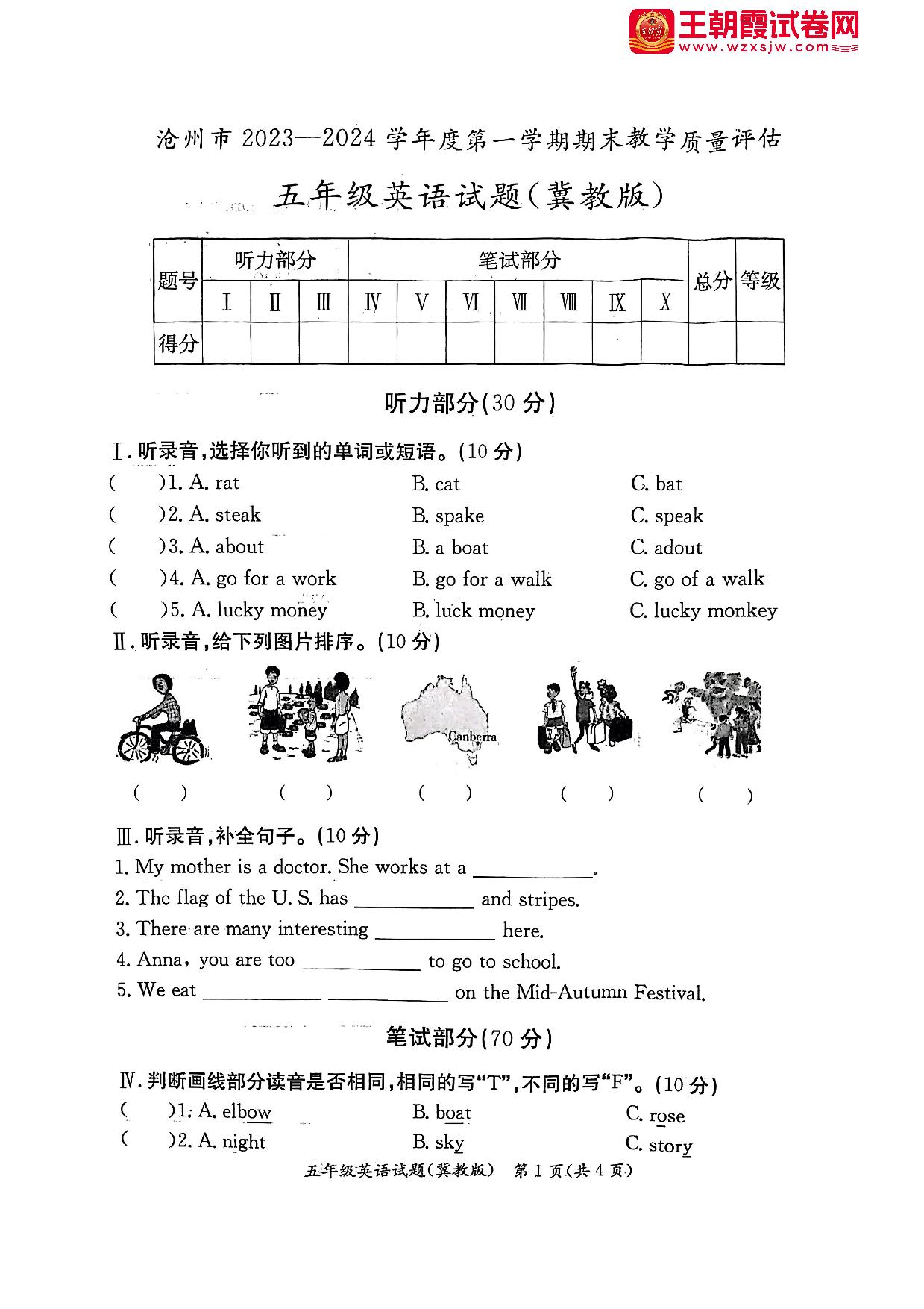 河北省沧州市2023-2024学年度第一学期期末教学质量评估试题五年级英语(冀教版)