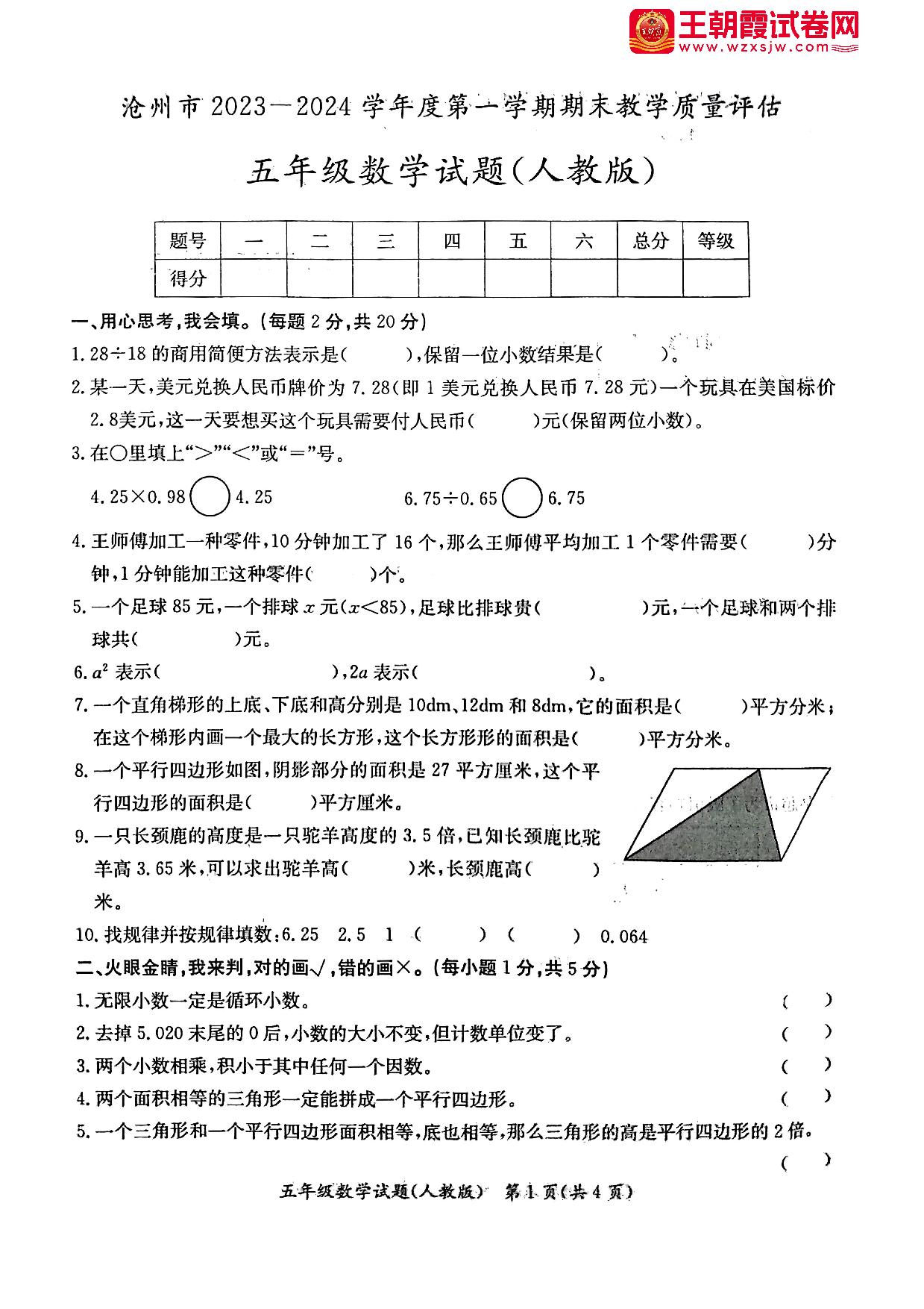河北省沧州市2023-2024学年度第一学期期末教学质量评估试题五年级数学(人教版)