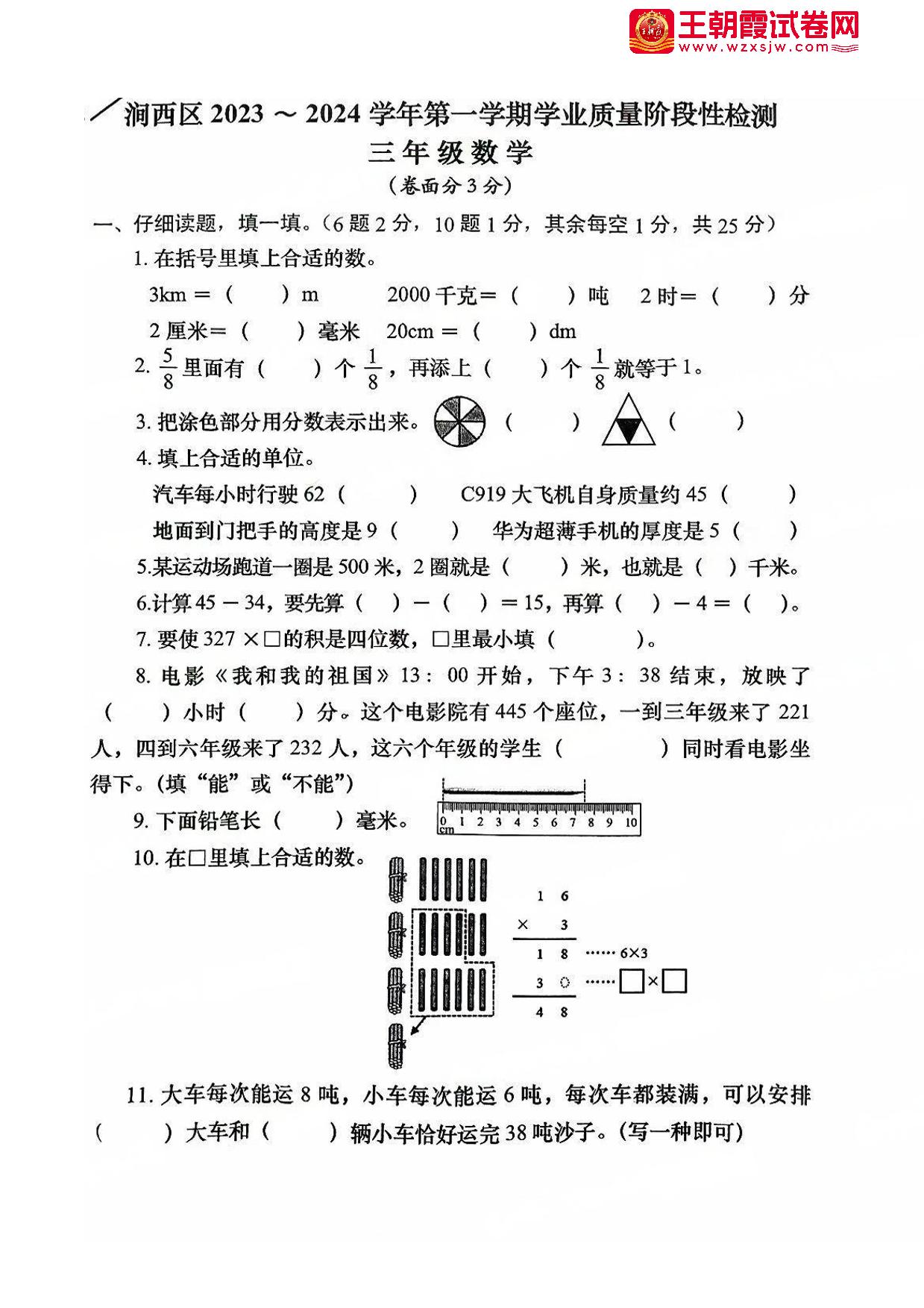 河南省洛阳市涧西区2023-2024学年第一学期期末学业质量阶段性检测三年级数学(人教版)