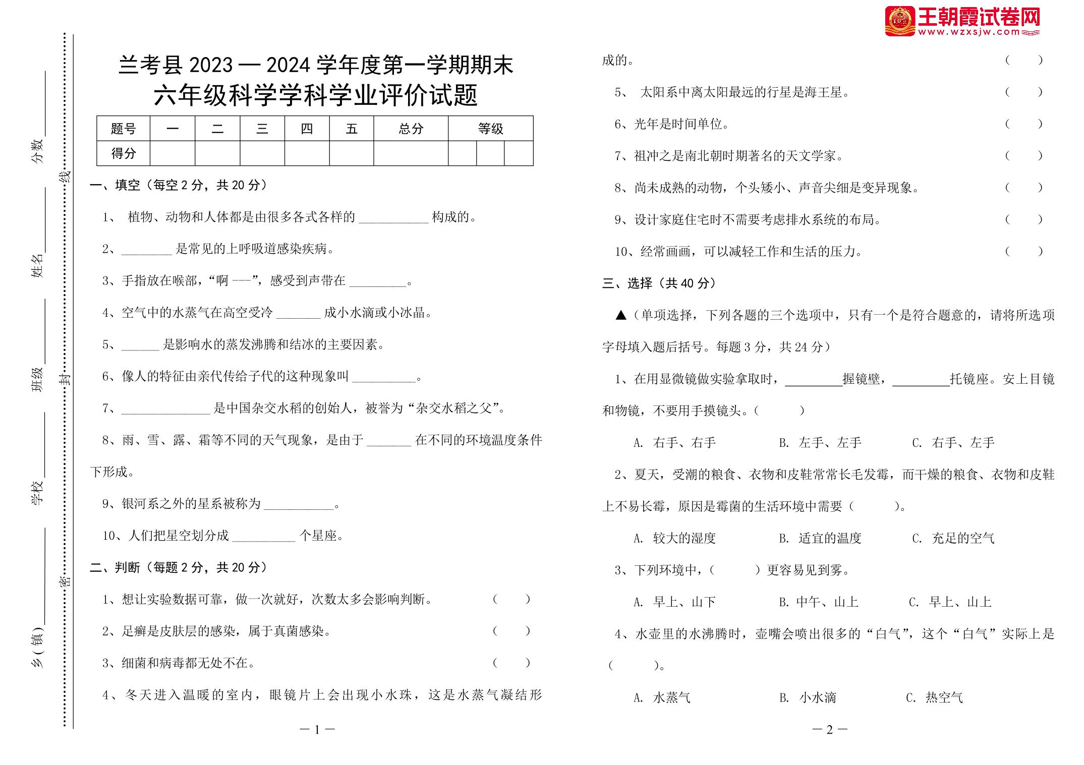 河南省开封市兰考县2023-2024学年度第一学期期末学业评价试题六年级科学(大象版)