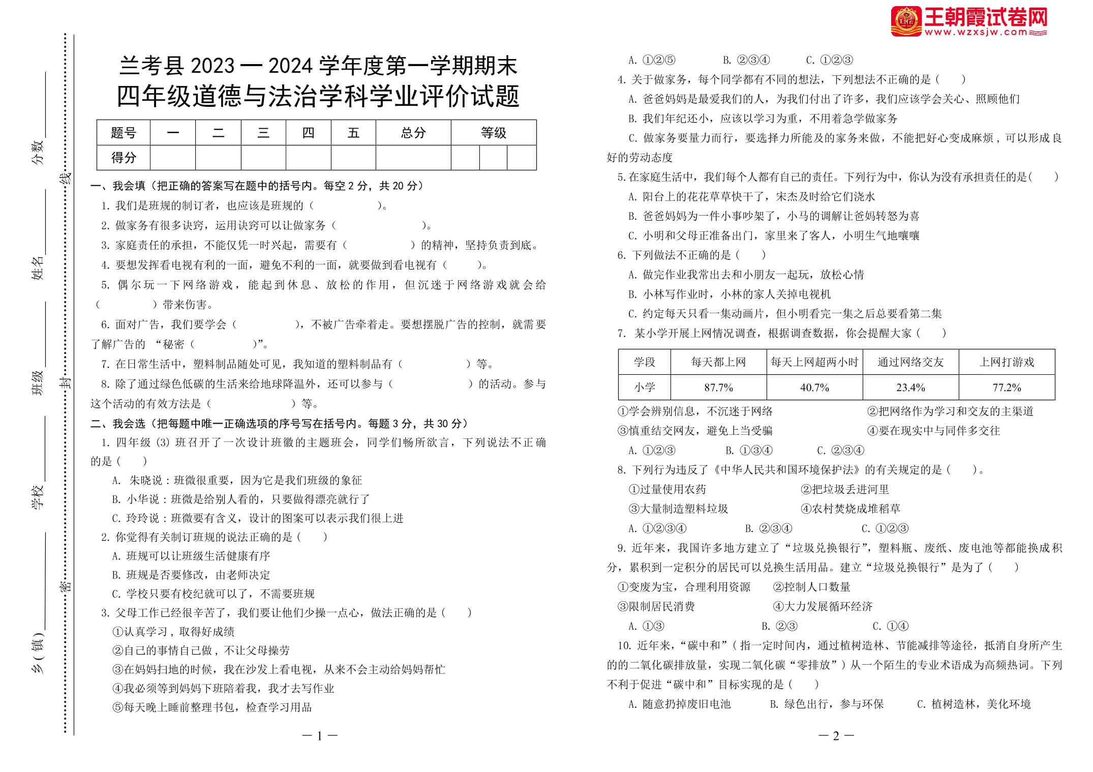 河南省开封市兰考县2023-2024学年度第一学期期末学业评价试题四年级道德与法治(人教版)